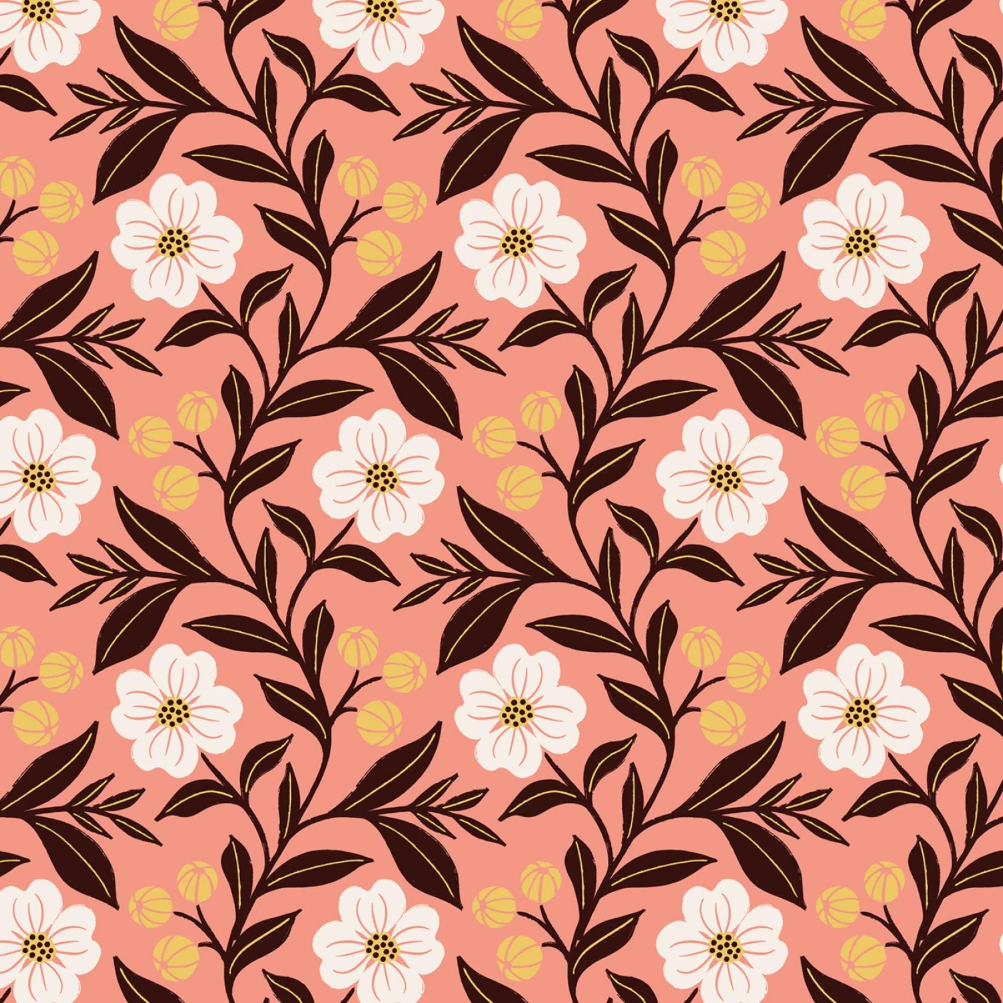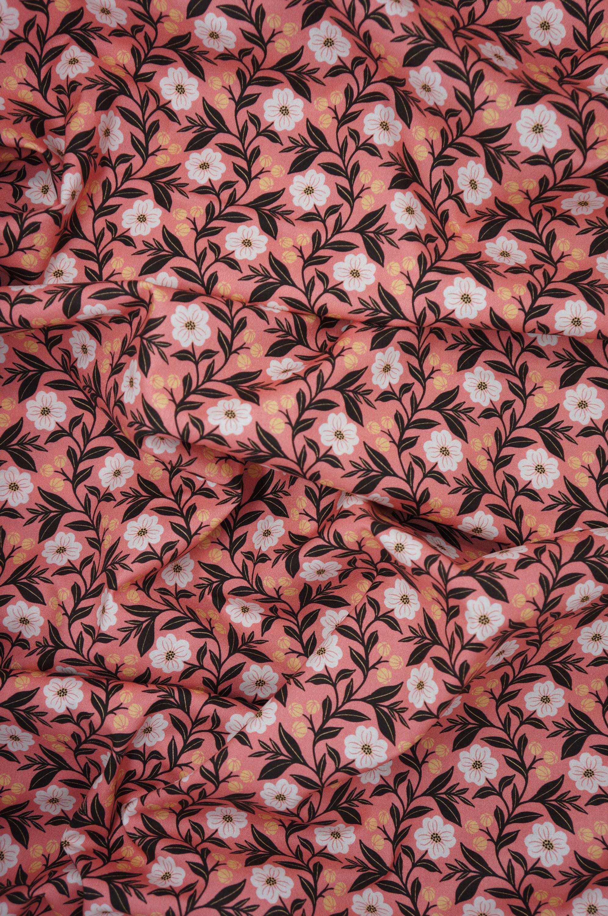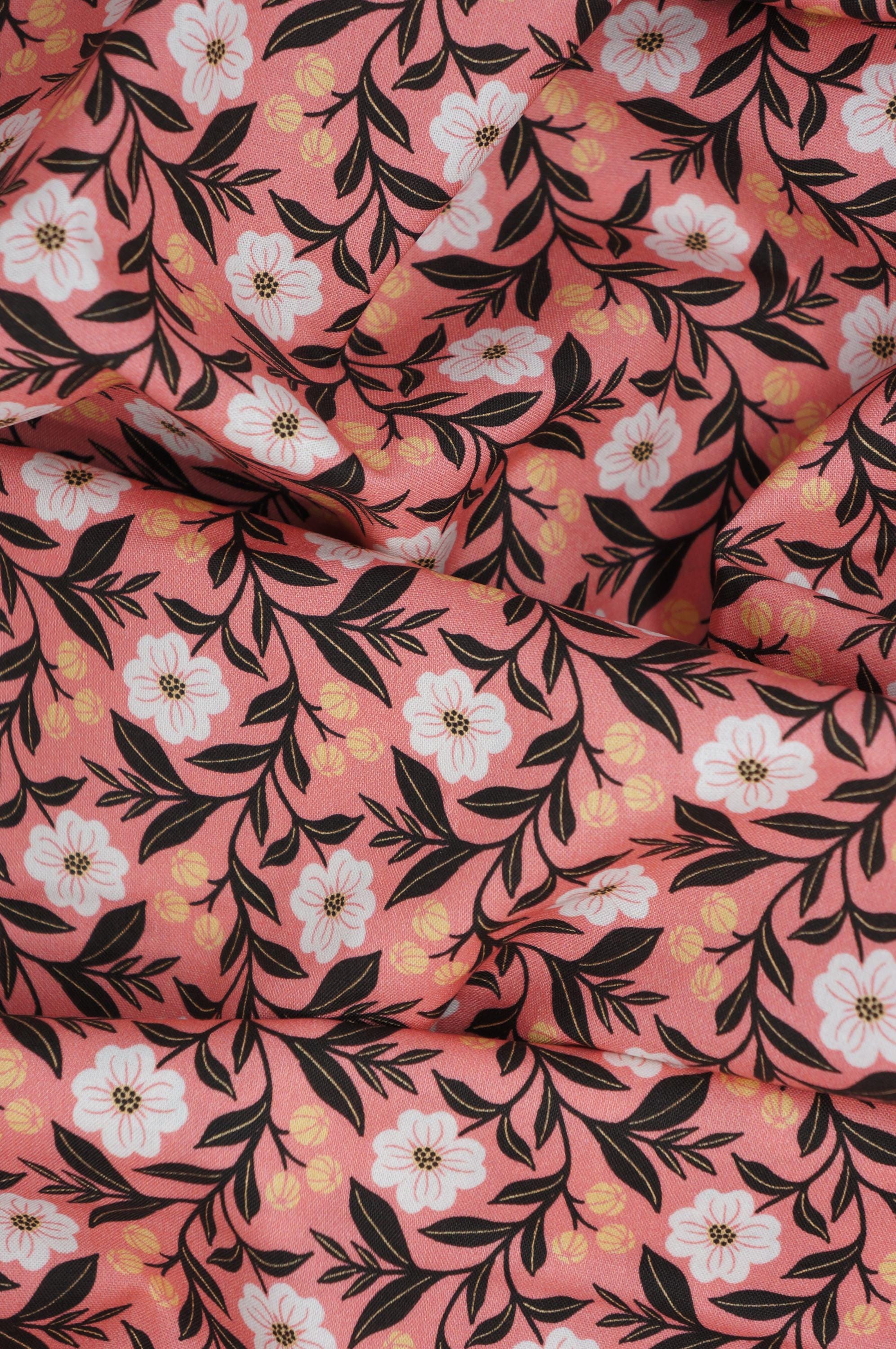 If you love florals, you will adore this fabric from the Honey Garden by Juliana Tipton Collection for Cloud 9 Organic Quilting Cotton Fabric called Pink Dogwood. This fabric features a vibrant and charming design with pink dogwood flowers in white, accented by dark green leaves and yellow buds, all set against a warm coral background. The pattern is both lively and elegant, making it perfect for creating unique garments or home decor items that stand out with a touch of nature-inspired beauty. This 100% certified organic cotton fabric is high quality, durable and easy to sew with.