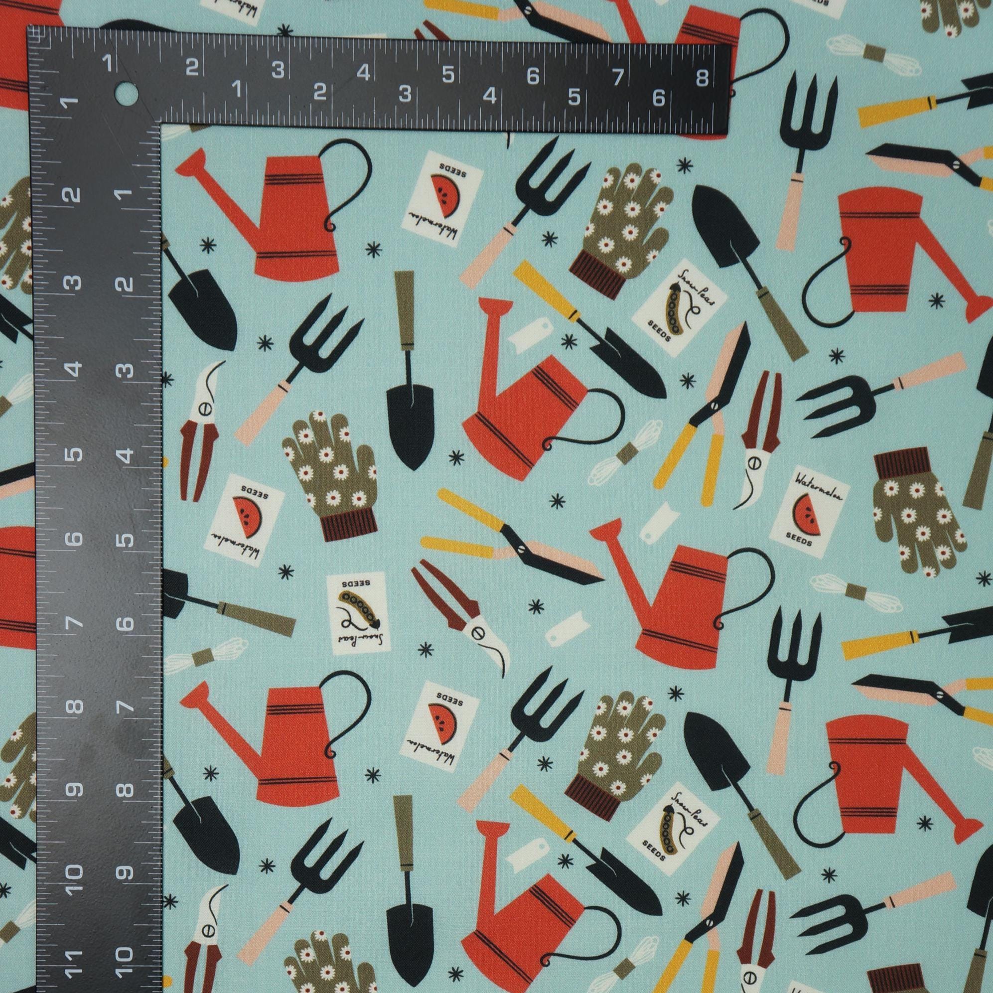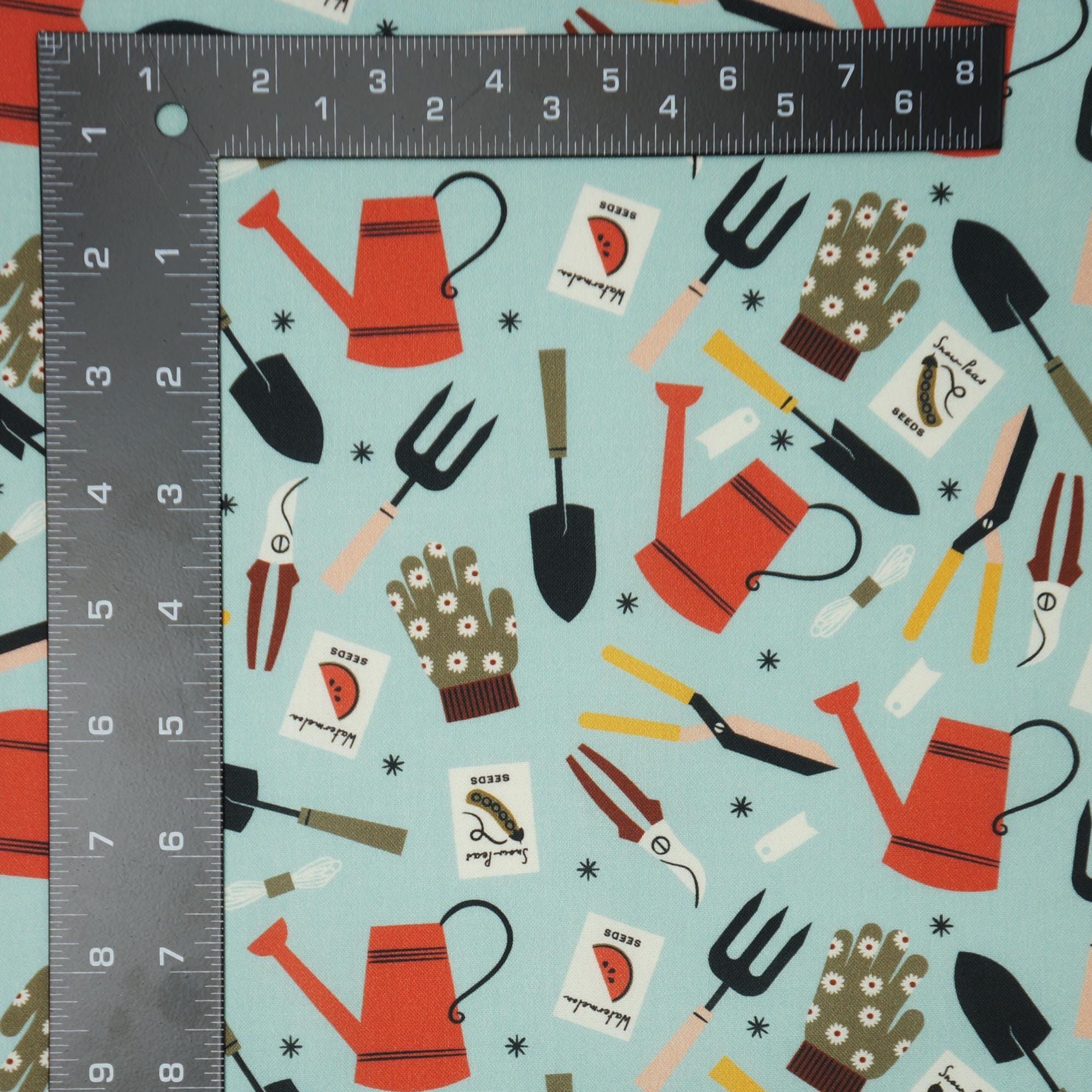 If you love gardening, you'll adore this fabric from the Homestead Haven Collection by Cloud 9 Fabrics. This charming fabric features a delightful garden-themed print with illustrations of gardening tools like watering cans, gloves, forks, and seed packets, all set against a soft light blue background. The design is playful yet practical, making it perfect for quilting projects that celebrate the joys of gardening. The fabric's organic cotton composition ensures it's both eco-friendly and comfortable to work with, providing a high-quality base for your creative endeavors.