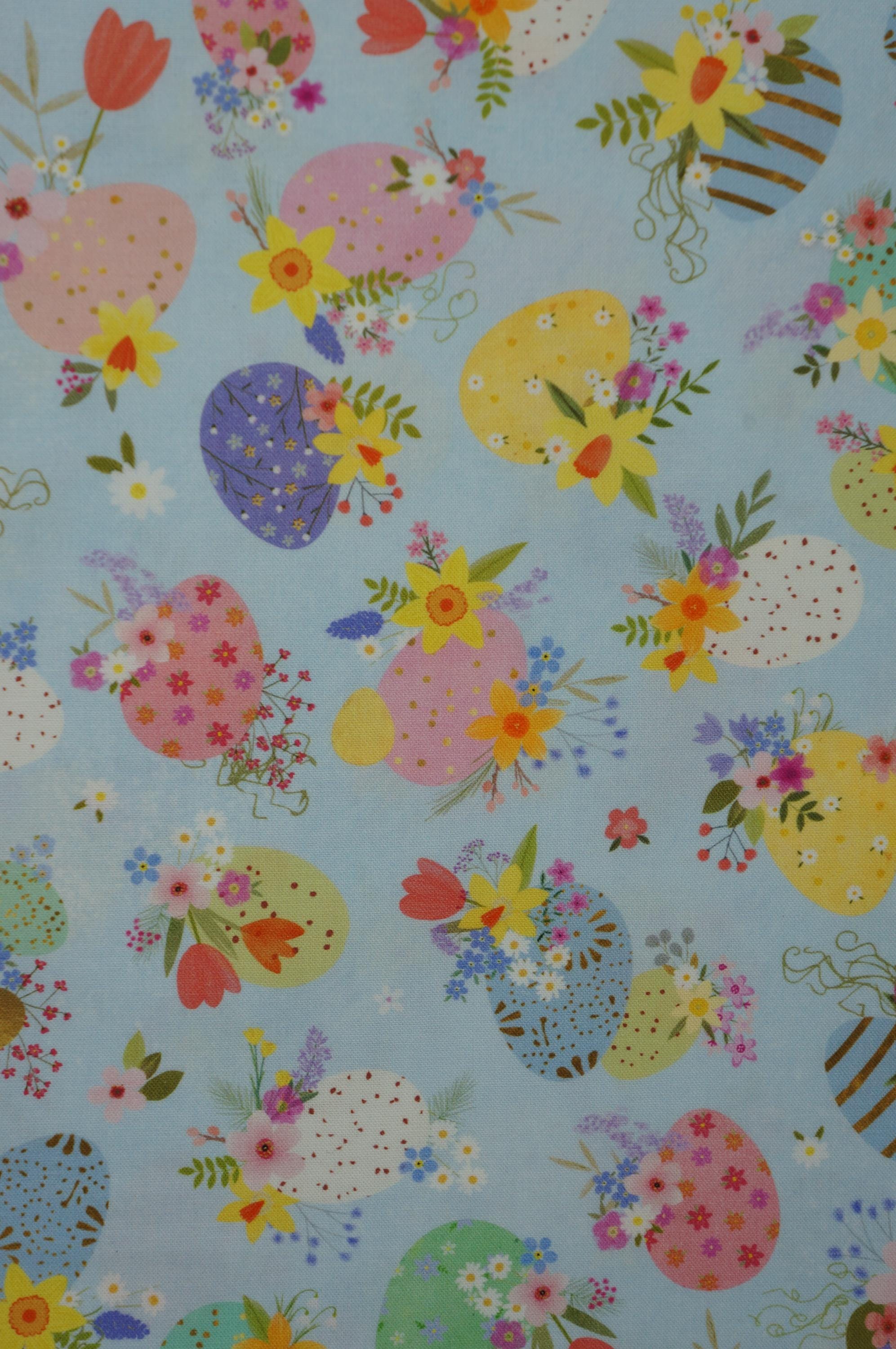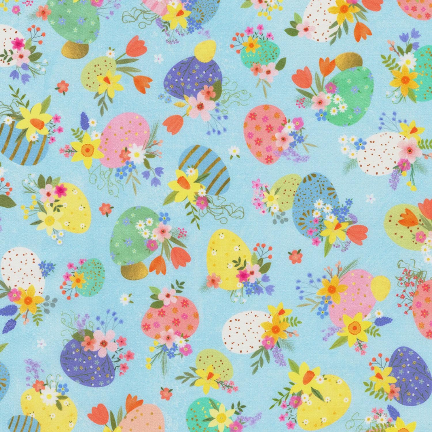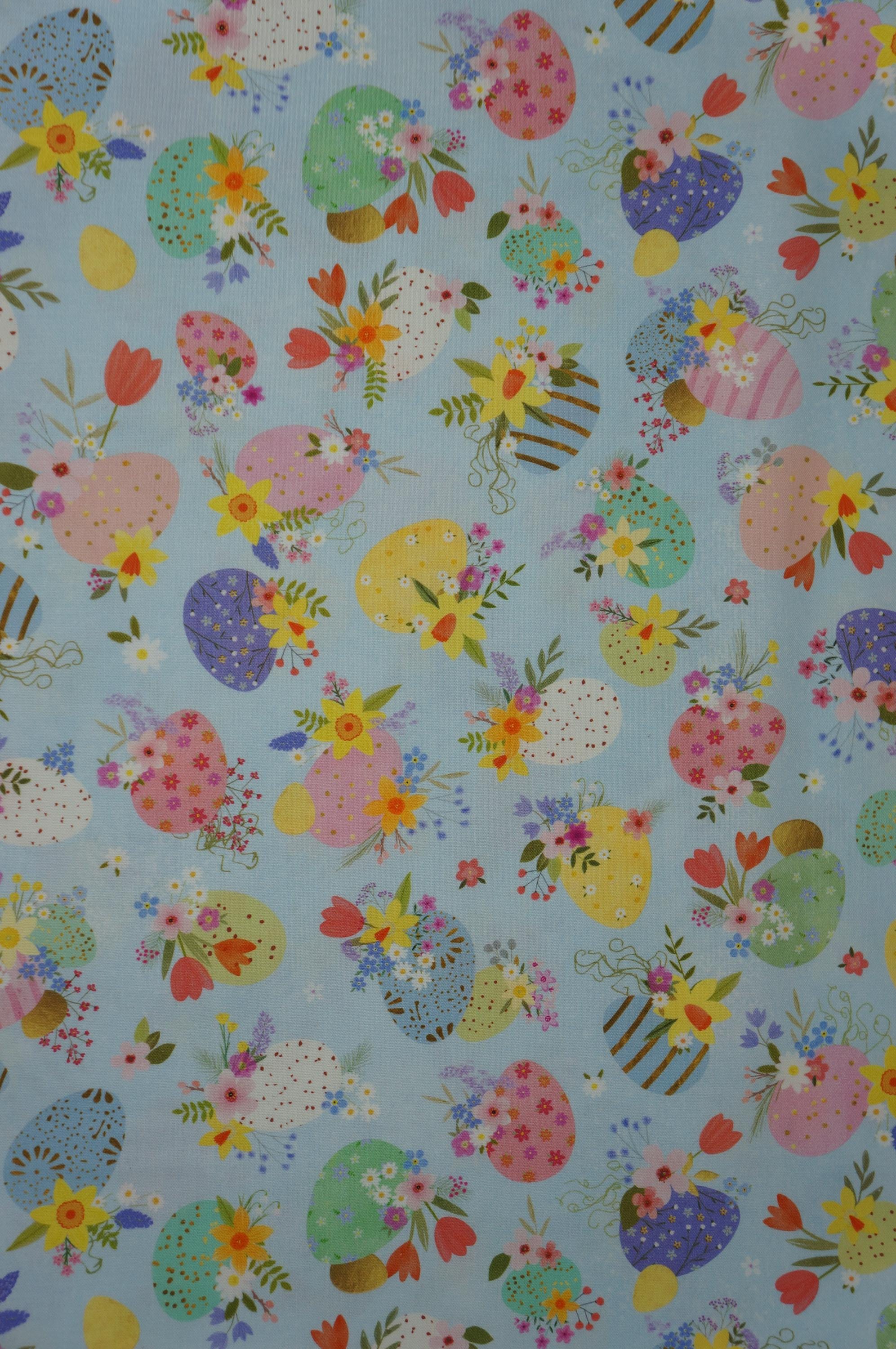 Celebrate Easter with this adorable quilting cotton fabric by Dotty Lottie from Robert Kaufman. This charming fabric features a delightful pattern of tossed Easter eggs and flowers set against a light blue background. The design is playful and vibrant, with eggs in various pastel colors adorned with intricate floral arrangements, including daffodils, tulips, and other spring blooms. The whimsical arrangement of the eggs and flowers creates a festive and joyful atmosphere, perfect for springtime projects, whether for crafting, quilting, or fashion. This fabric is high quality 100% cotton and is durable and easy to sew. Order now and get ready for the Easter celebration!