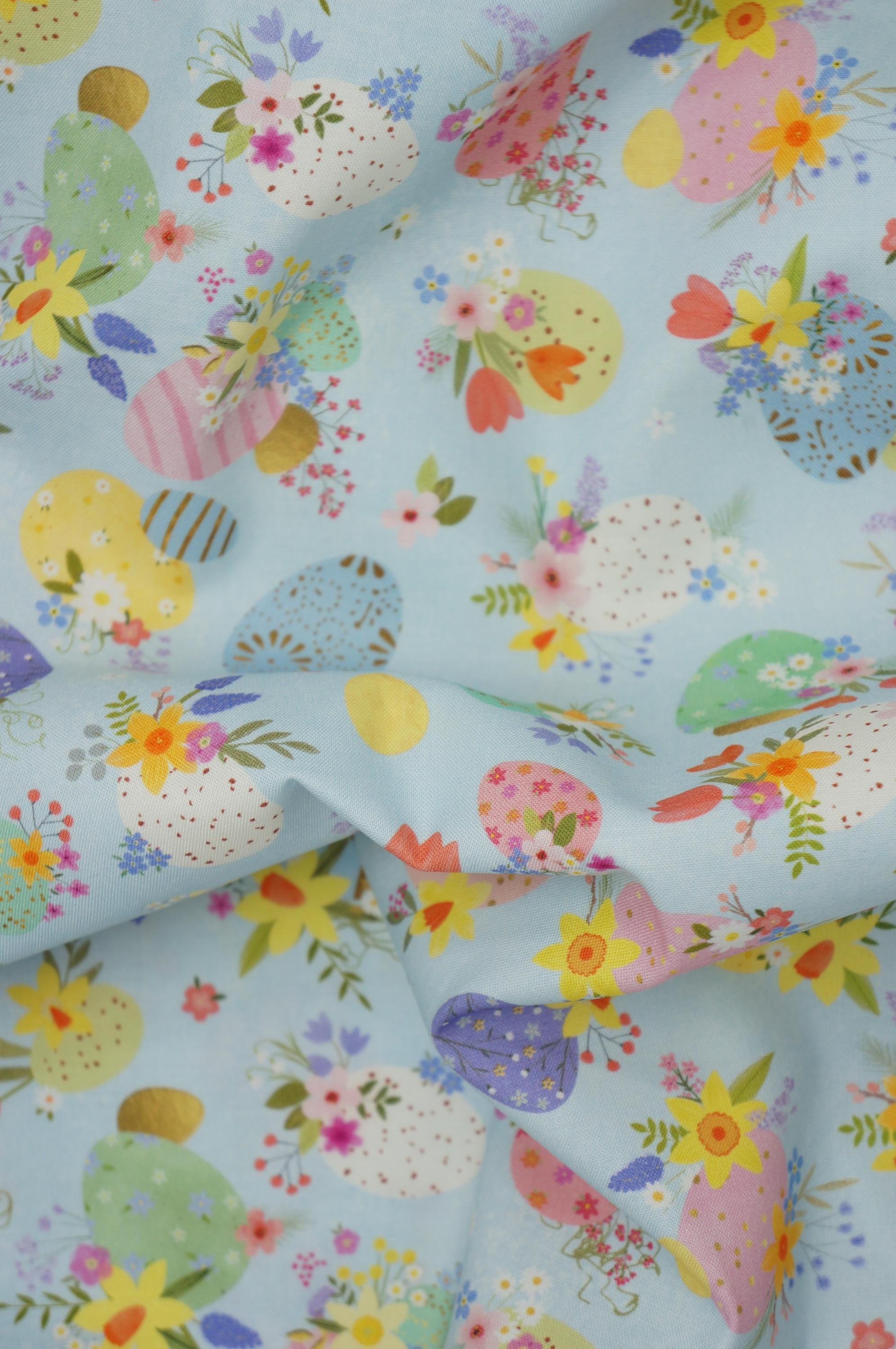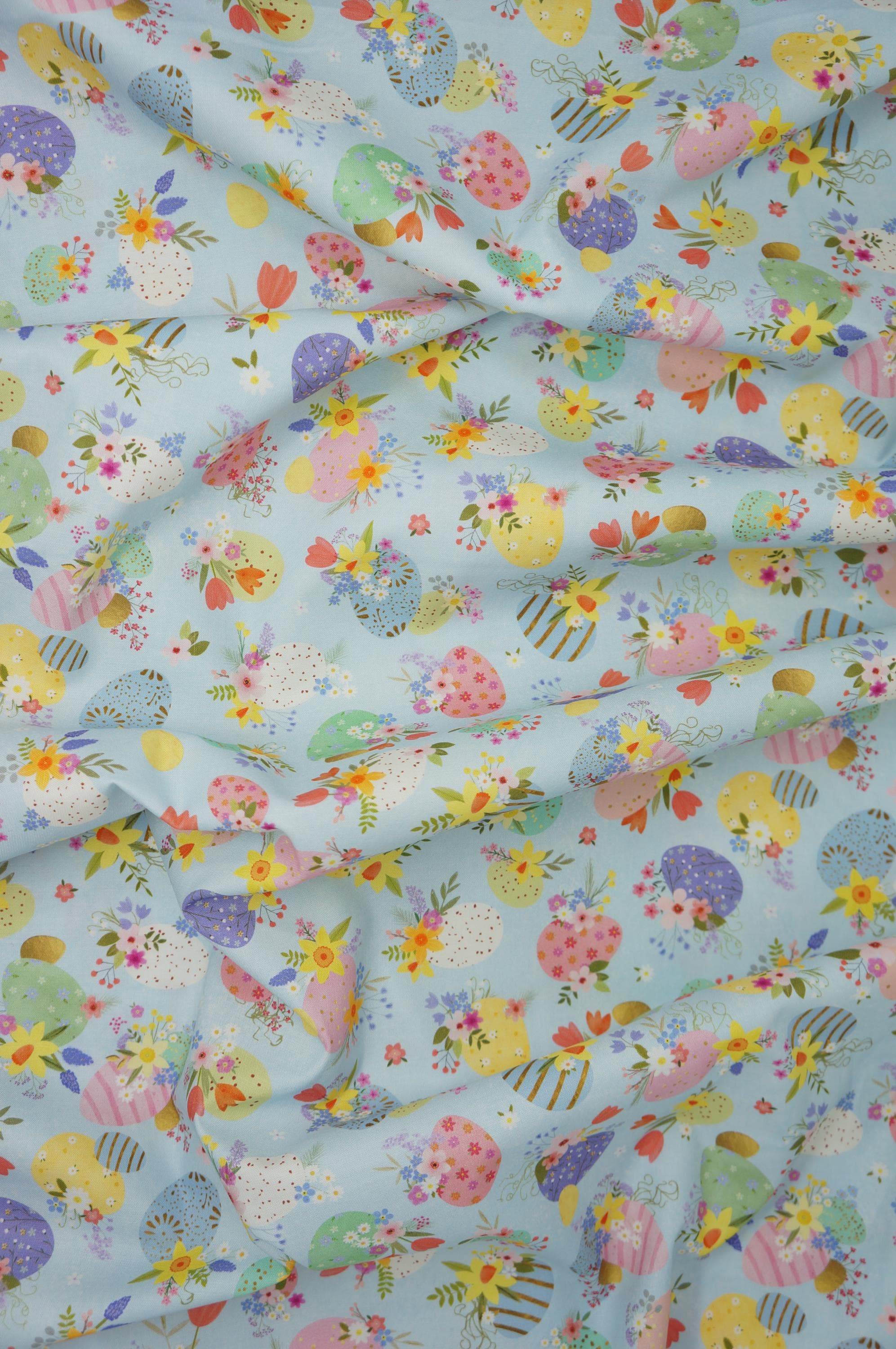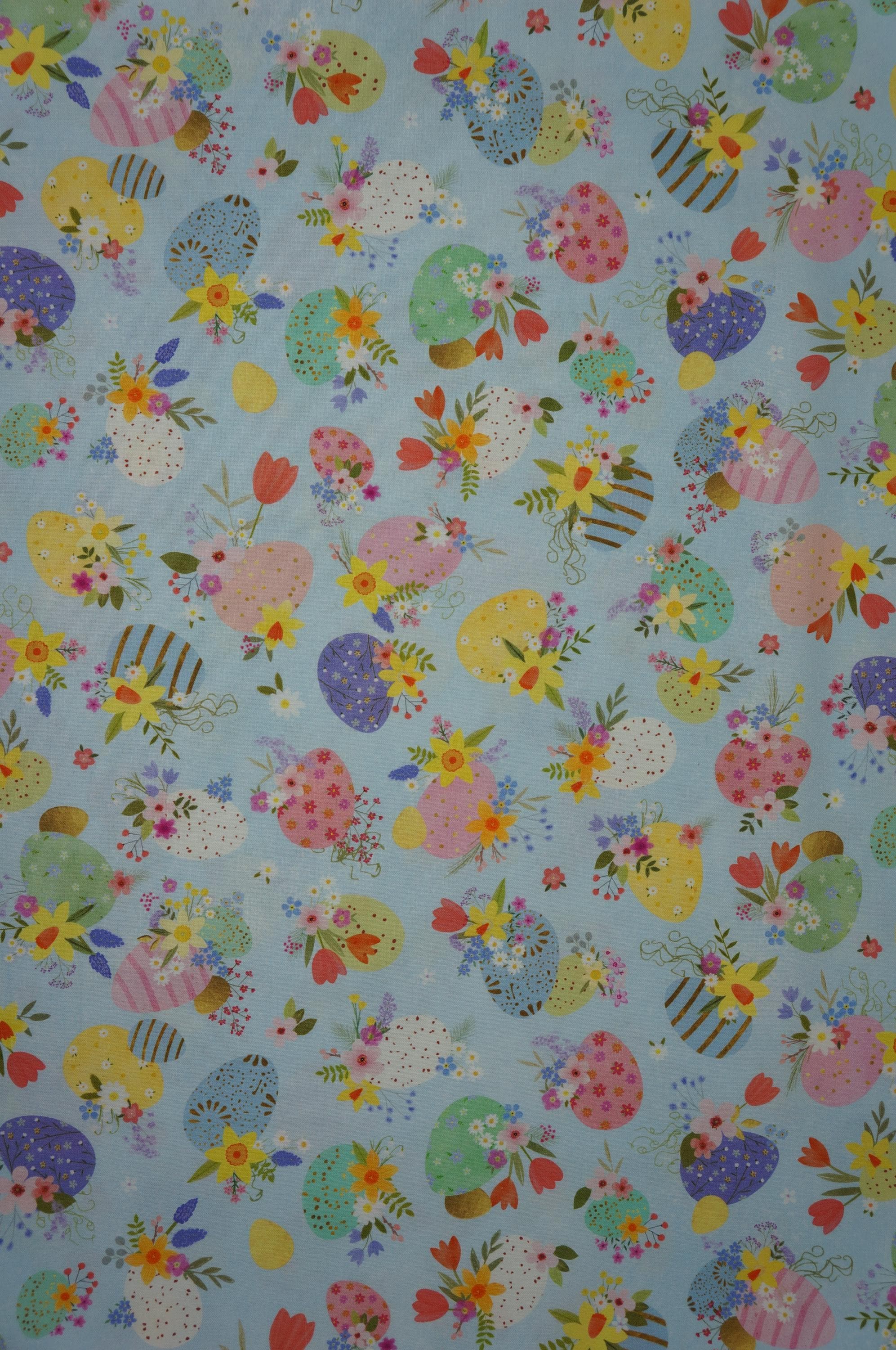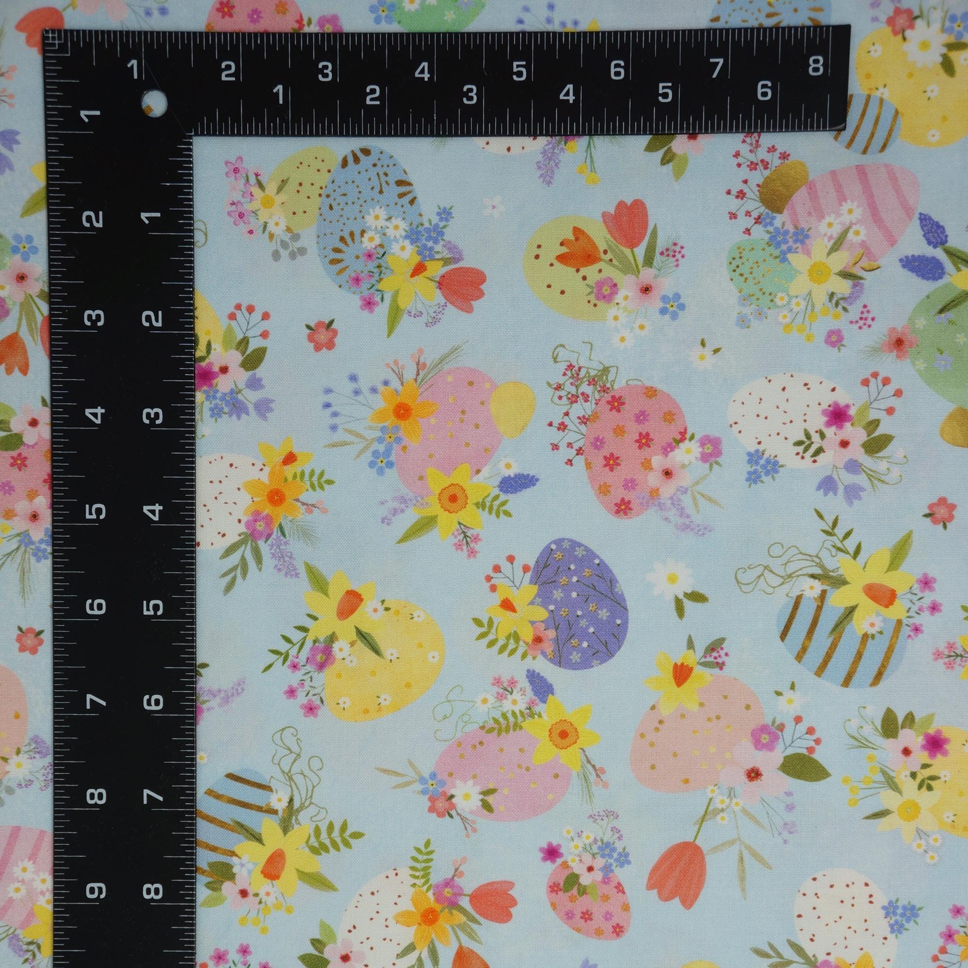 Celebrate Easter with this adorable quilting cotton fabric by Dotty Lottie from Robert Kaufman. This charming fabric features a delightful pattern of tossed Easter eggs and flowers set against a light blue background. The design is playful and vibrant, with eggs in various pastel colors adorned with intricate floral arrangements, including daffodils, tulips, and other spring blooms. The whimsical arrangement of the eggs and flowers creates a festive and joyful atmosphere, perfect for springtime projects, whether for crafting, quilting, or fashion. This fabric is high quality 100% cotton and is durable and easy to sew. Order now and get ready for the Easter celebration!