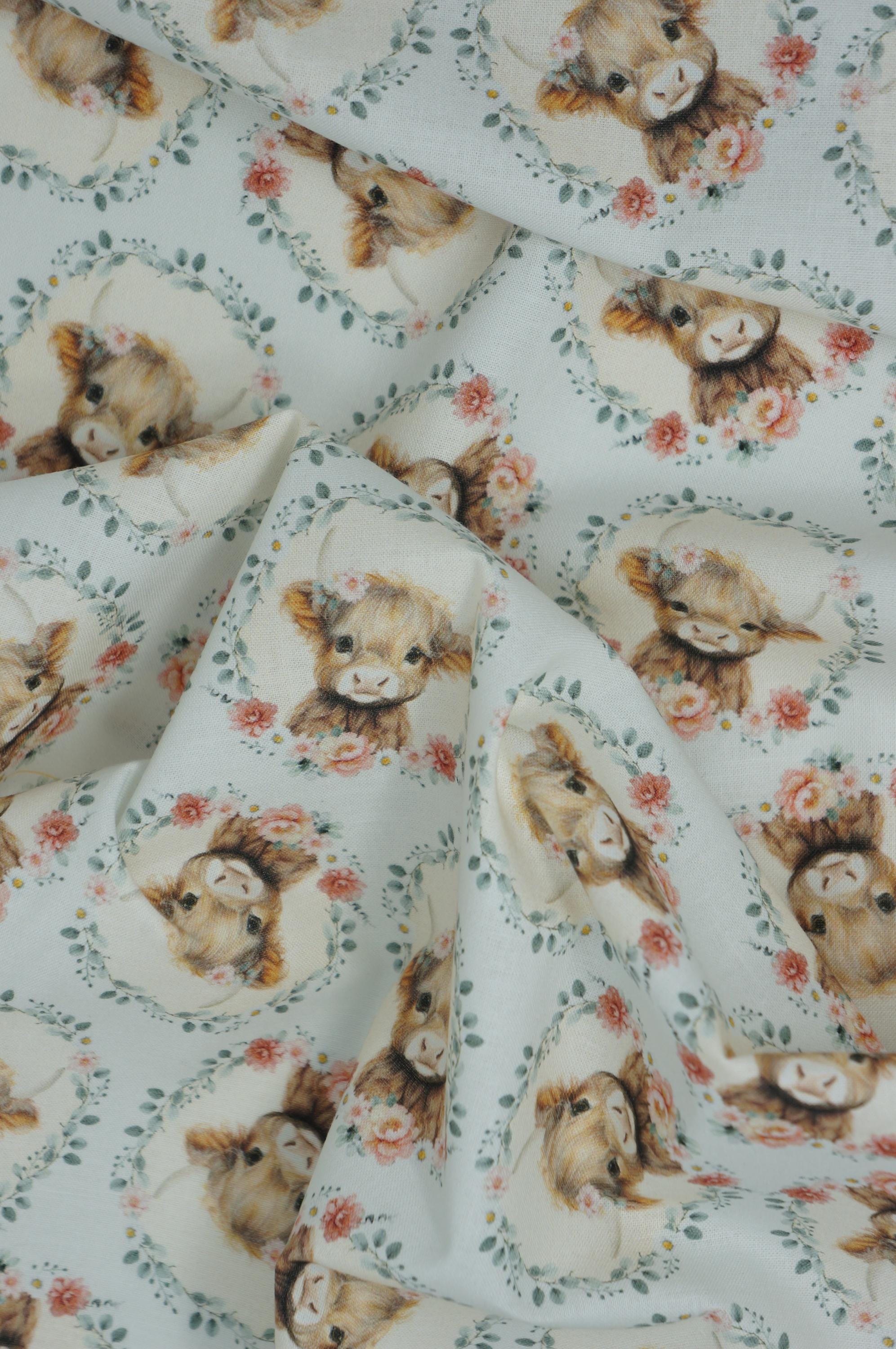 Say hello to the sweetest little herd you’ve ever seen! This Baby Highland Cow quilting cotton from Timeless Treasures features adorable fluffy calves framed in delicate floral wreaths, creating the perfect blend of farmhouse charm and soft, whimsical beauty. Set against a light-blue, airy background, these precious highland faces with their tousled bangs and gentle expressions are ideal for baby quilts, nursery décor, children’s apparel, pillowcases, tote bags, and cozy farmhouse-inspired projects. The high-quality 100% cotton fabric is soft, smooth, and easy to sew—making it a joy for both beginner and experienced quilters alike. If you love rustic elegance with a touch of sweetness, this darling Highland Cow print will add heart-melting charm to your next handmade creation!