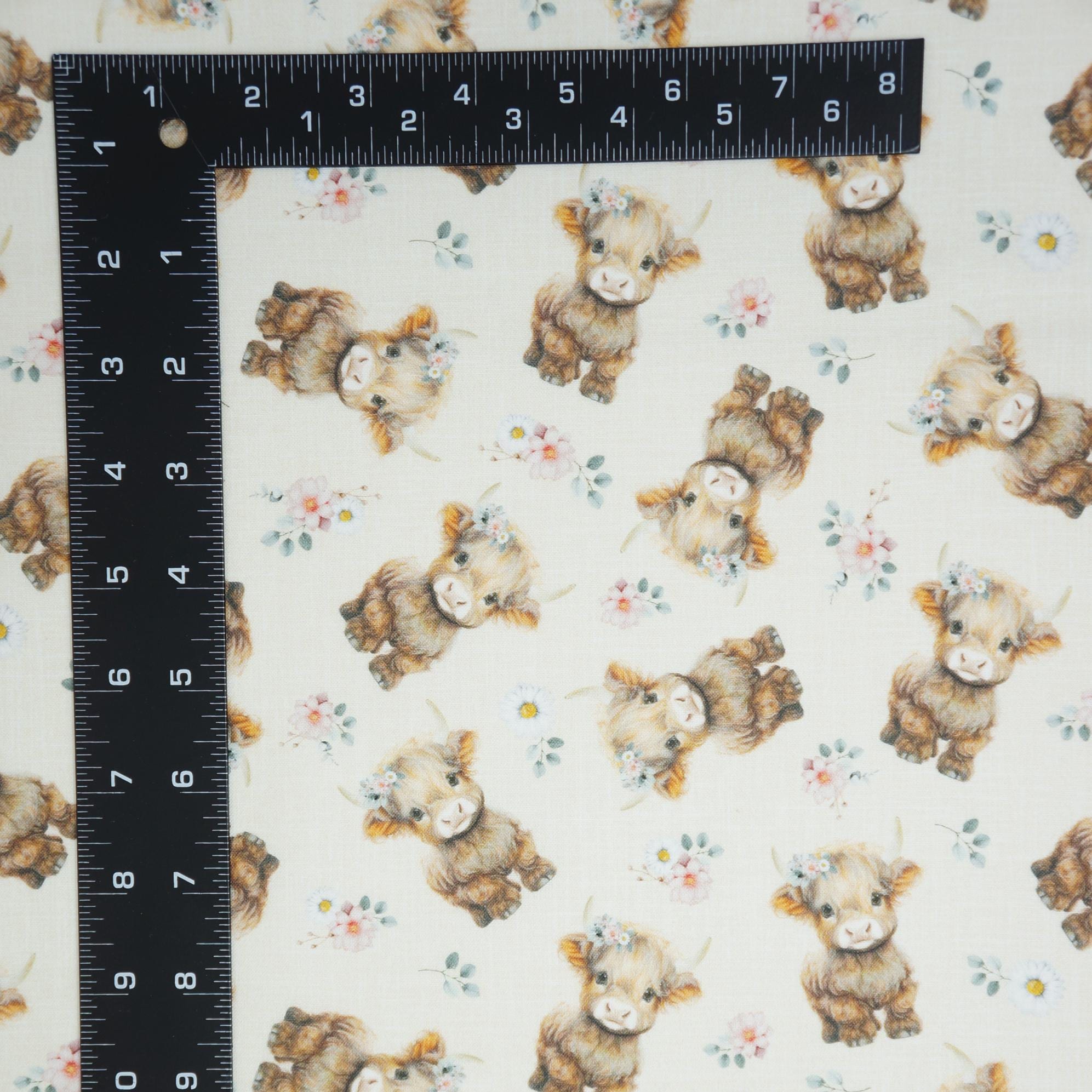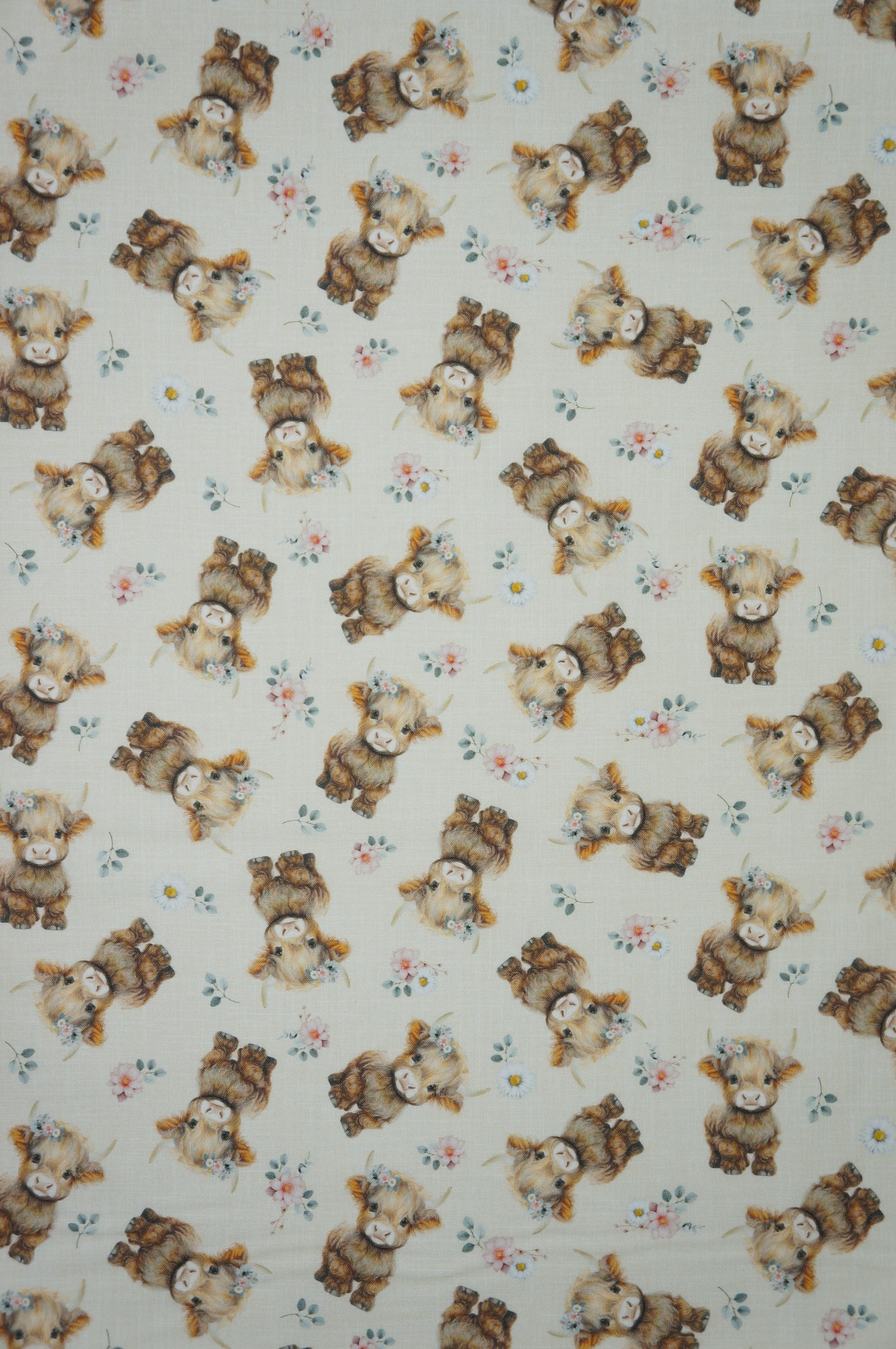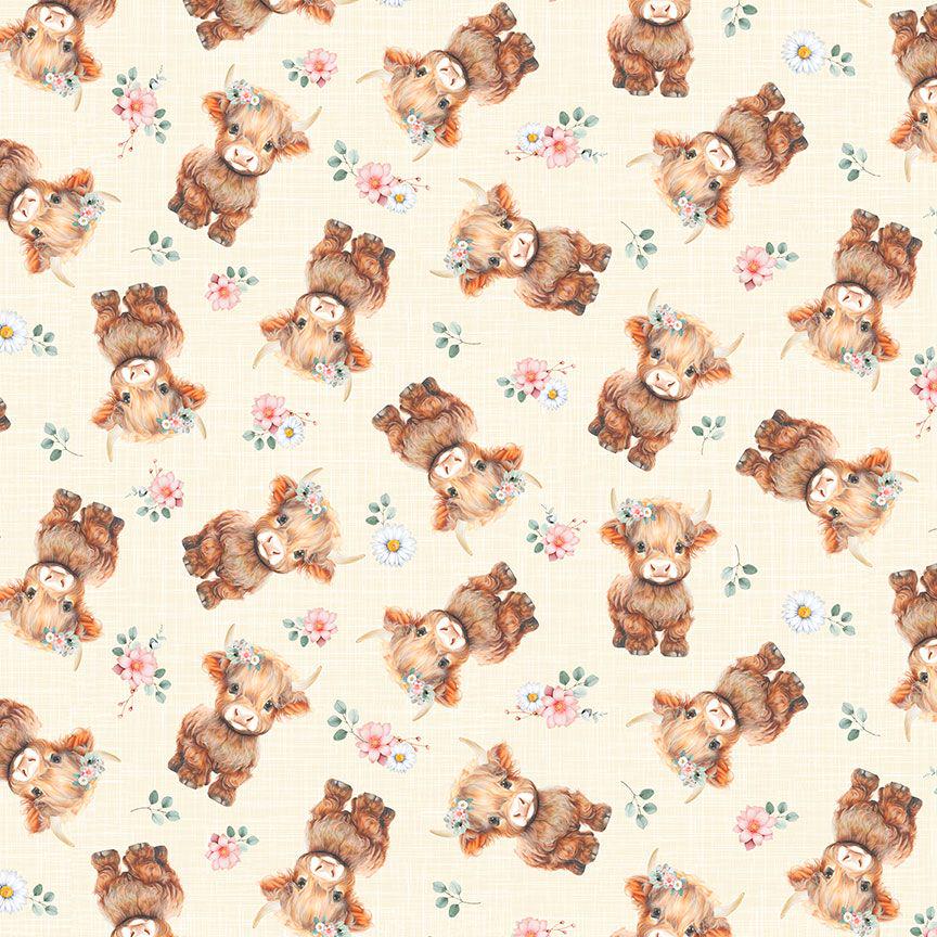Fall head over heels for this absolutely adorable Baby Highland Cow quilting cotton from Timeless Treasures! Featuring sweet, fluffy little Highland calves with soft brown coats, gentle expressions, and delicate floral crowns scattered among charming blossoms on a warm neutral light yellow background, this fabric is pure country-cute perfection. The watercolor-style artwork adds a cozy, storybook feel that’s perfect for baby quilts, nursery décor, children’s apparel, farmhouse accents, tote bags, and so much more. Printed on high-quality 100% cotton with a smooth hand and vibrant detail, this fabric is a dream to sew and will make any project feel extra special and heartfelt. Whether you’re stitching up a gift or adding to your stash, these darling baby Highland cows are sure to bring smiles to everyone who sees them!