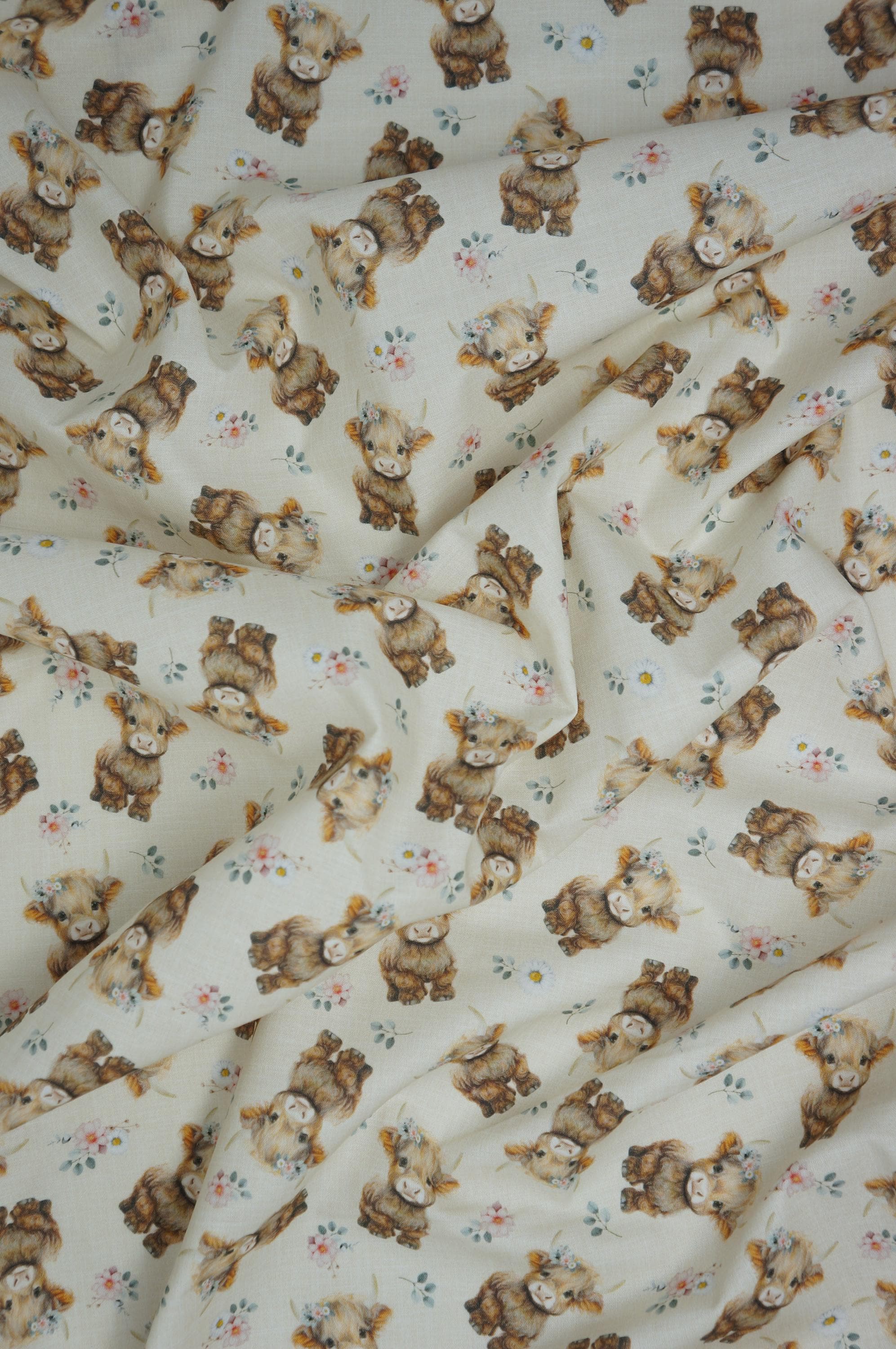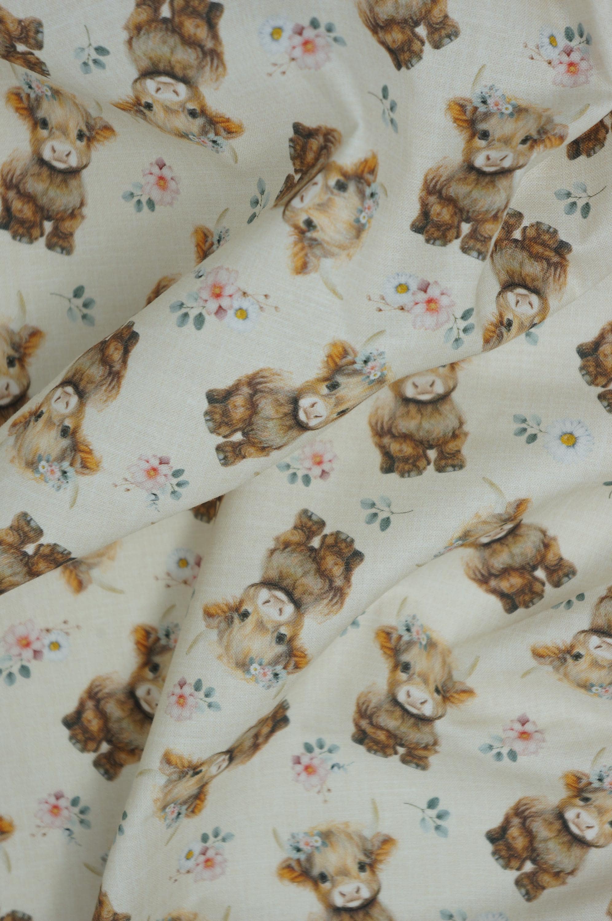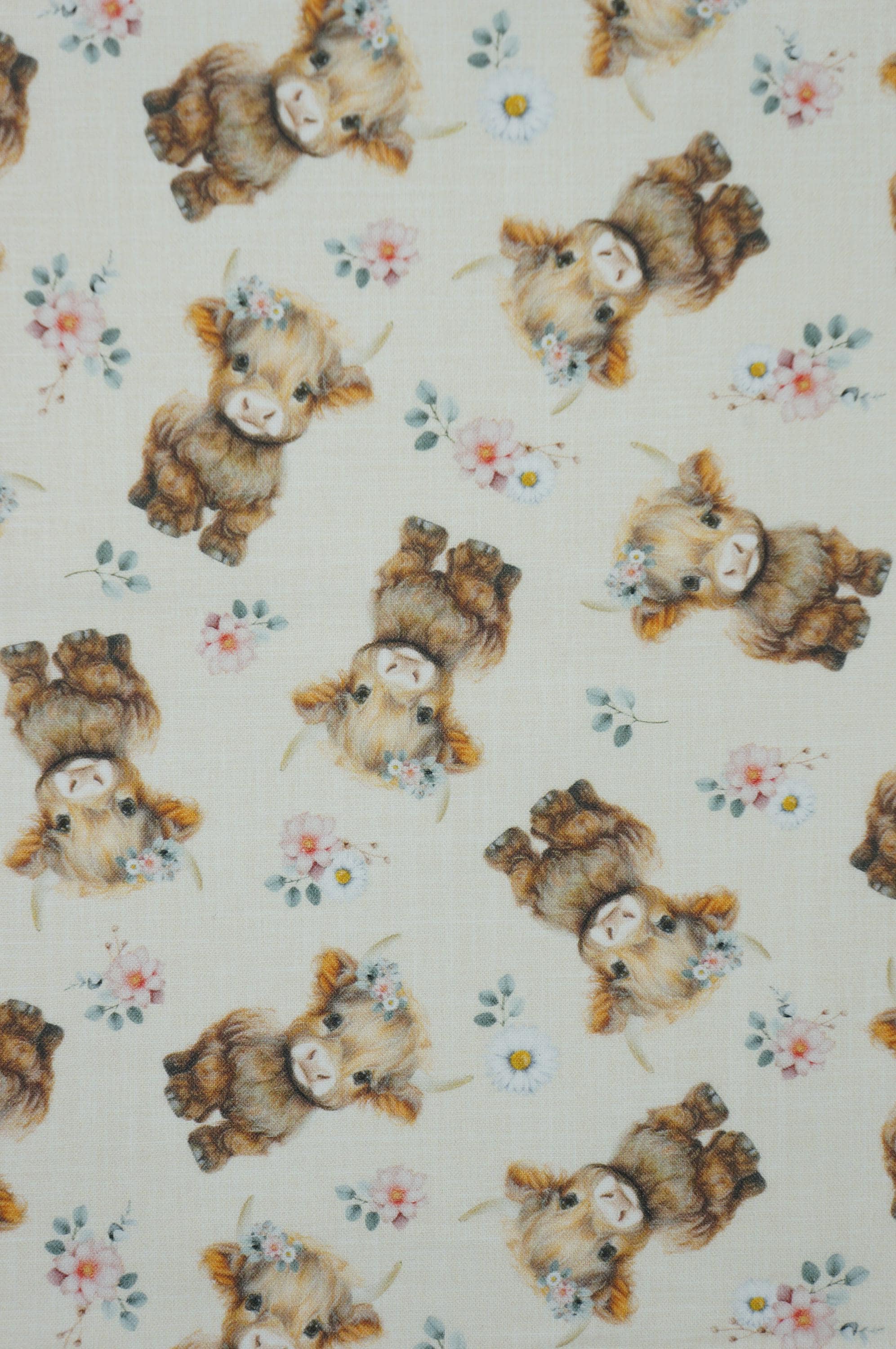 Fall head over heels for this absolutely adorable Baby Highland Cow quilting cotton from Timeless Treasures! Featuring sweet, fluffy little Highland calves with soft brown coats, gentle expressions, and delicate floral crowns scattered among charming blossoms on a warm neutral light yellow background, this fabric is pure country-cute perfection. The watercolor-style artwork adds a cozy, storybook feel that’s perfect for baby quilts, nursery décor, children’s apparel, farmhouse accents, tote bags, and so much more. Printed on high-quality 100% cotton with a smooth hand and vibrant detail, this fabric is a dream to sew and will make any project feel extra special and heartfelt. Whether you’re stitching up a gift or adding to your stash, these darling baby Highland cows are sure to bring smiles to everyone who sees them!