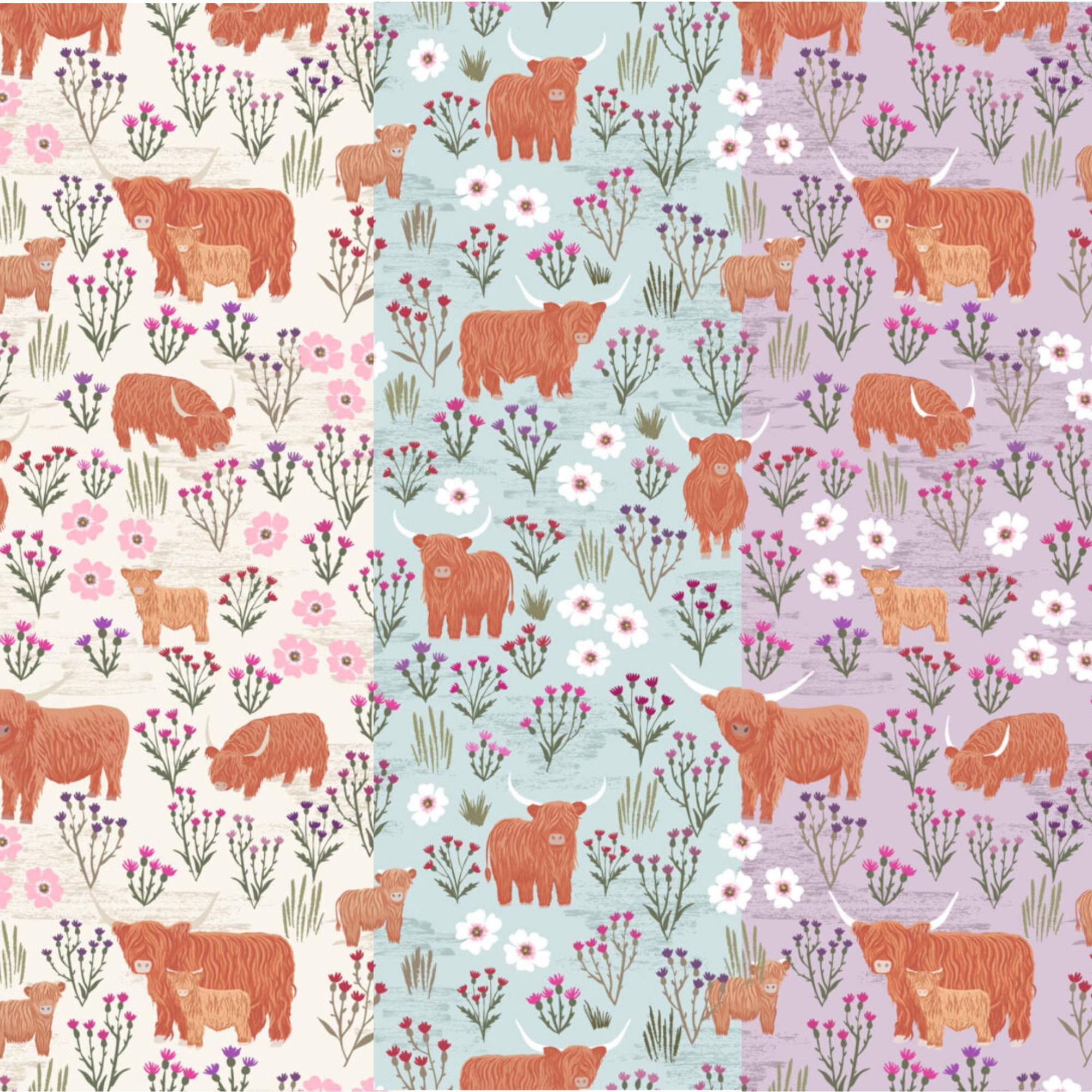 Celebrate the charm of the Scottish countryside with our whimsical Celtic Summer fabric collection. This seasonal range brings a playful twist to our ever-popular Highland cows – those gentle, shaggy-coated icons of the Highlands – now basking in the warmth of summer and surrounded by nature’s bloom. This soft and breezy collection is inspired by the Celtic landscape in full bloom. You’ll find delicate prints in sun-washed hues of light purple, duck egg blue, soft pink, cream, and sky blue. Traditional thistles, buzzing bees, cheerful flowers, and classic checks weave a story of heritage and warmth throughout each design.