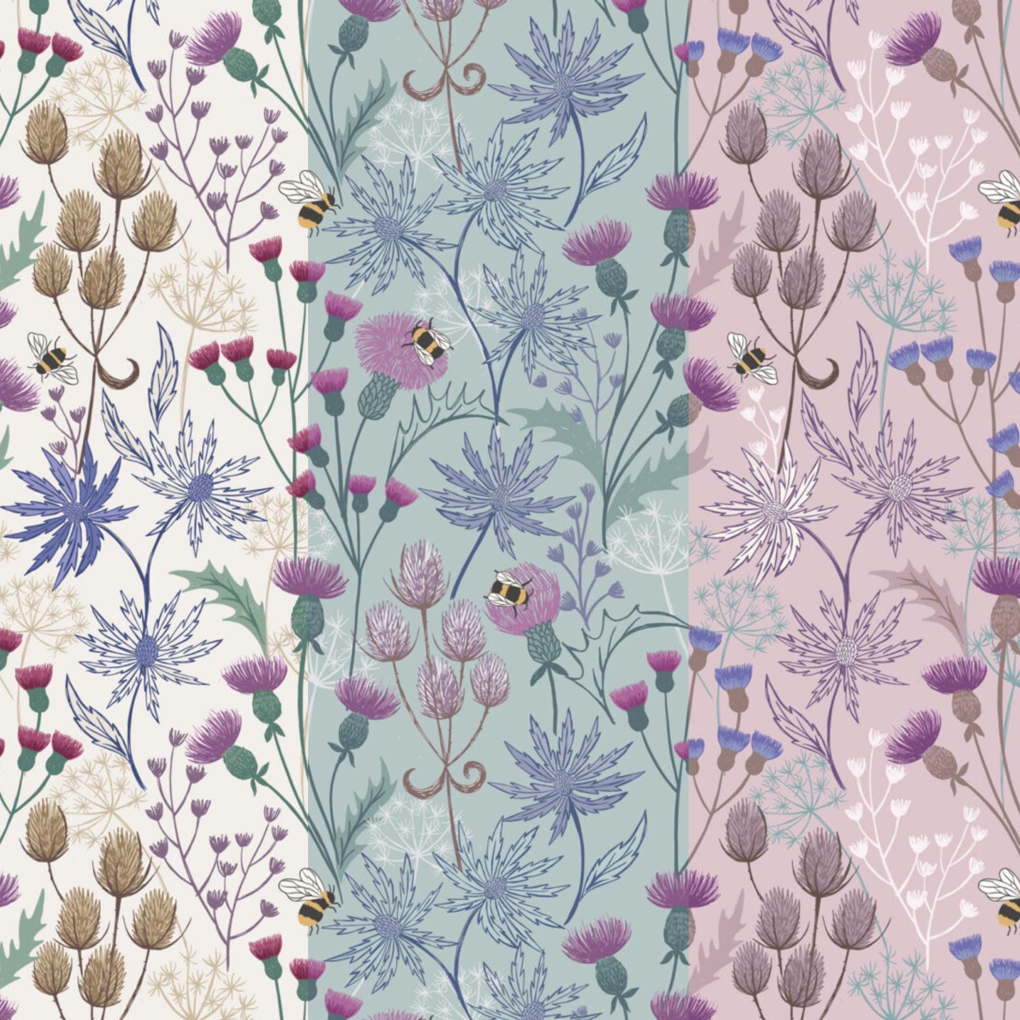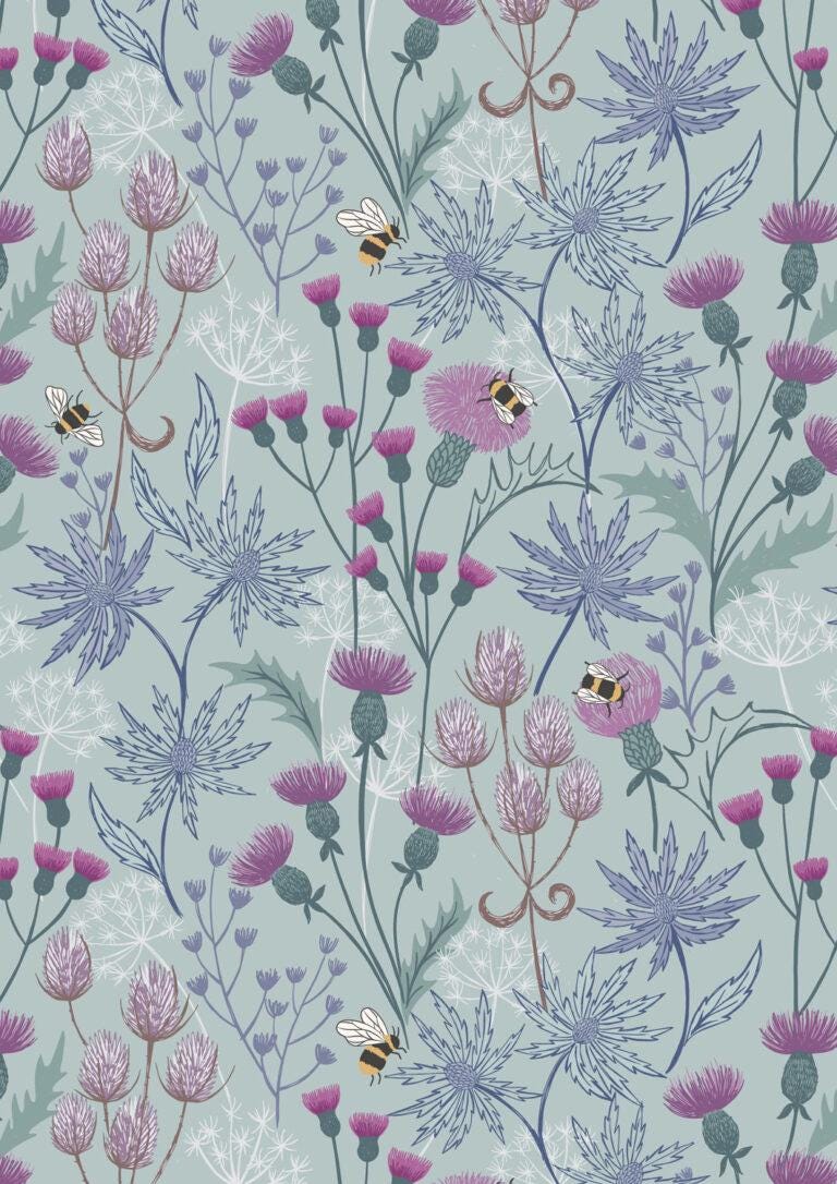 Celebrate the charm of the Scottish countryside with our whimsical Celtic Summer fabric collection. This seasonal range brings a playful twist to our ever-popular Highland cows – those gentle, shaggy-coated icons of the Highlands – now basking in the warmth of summer and surrounded by nature’s bloom. This soft and breezy collection is inspired by the Celtic landscape in full bloom. You’ll find delicate prints in sun-washed hues of light purple, duck egg blue, soft pink, cream, and sky blue. Traditional thistles, buzzing bees, cheerful flowers, and classic checks weave a story of heritage and warmth throughout each design.