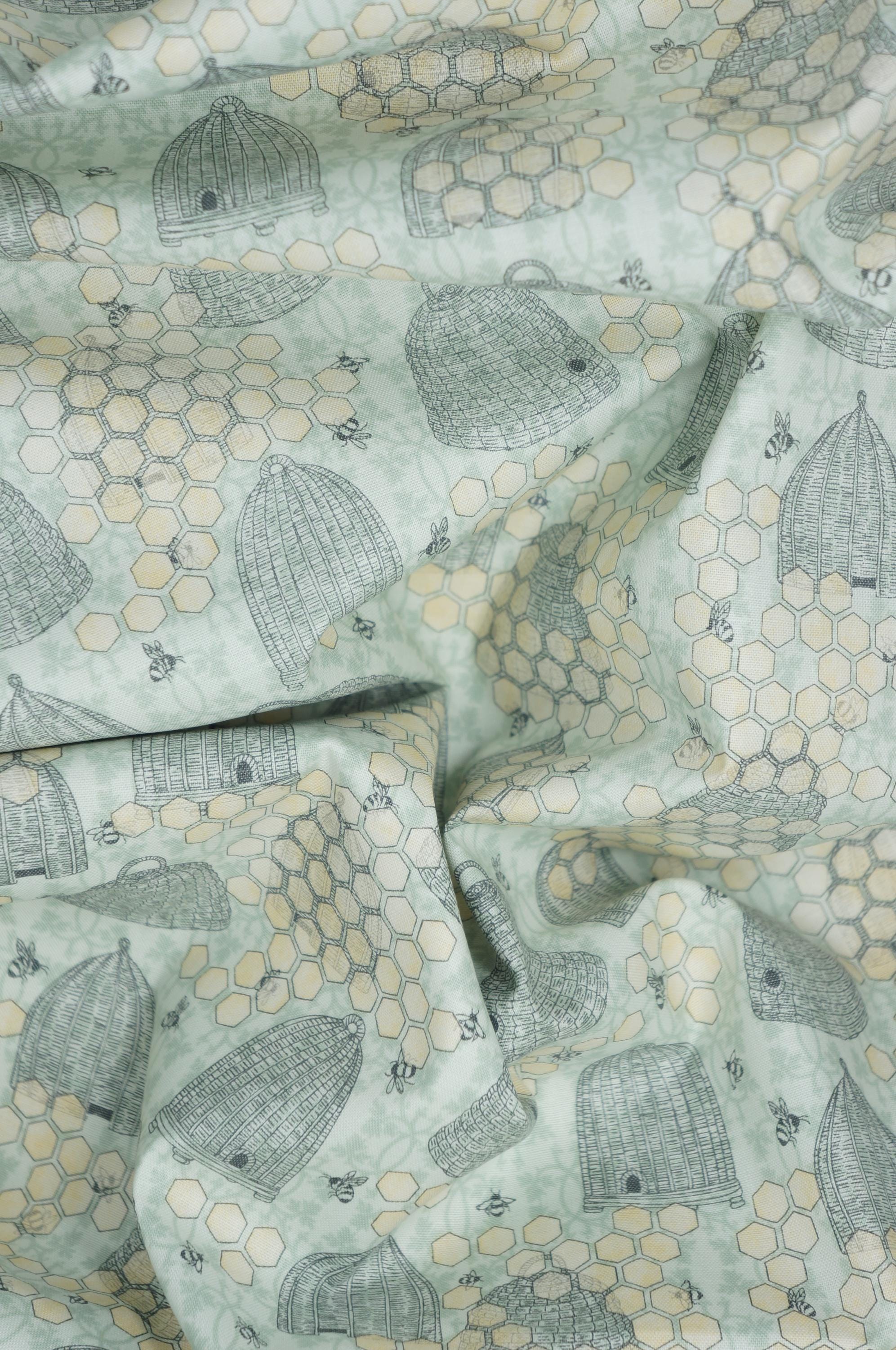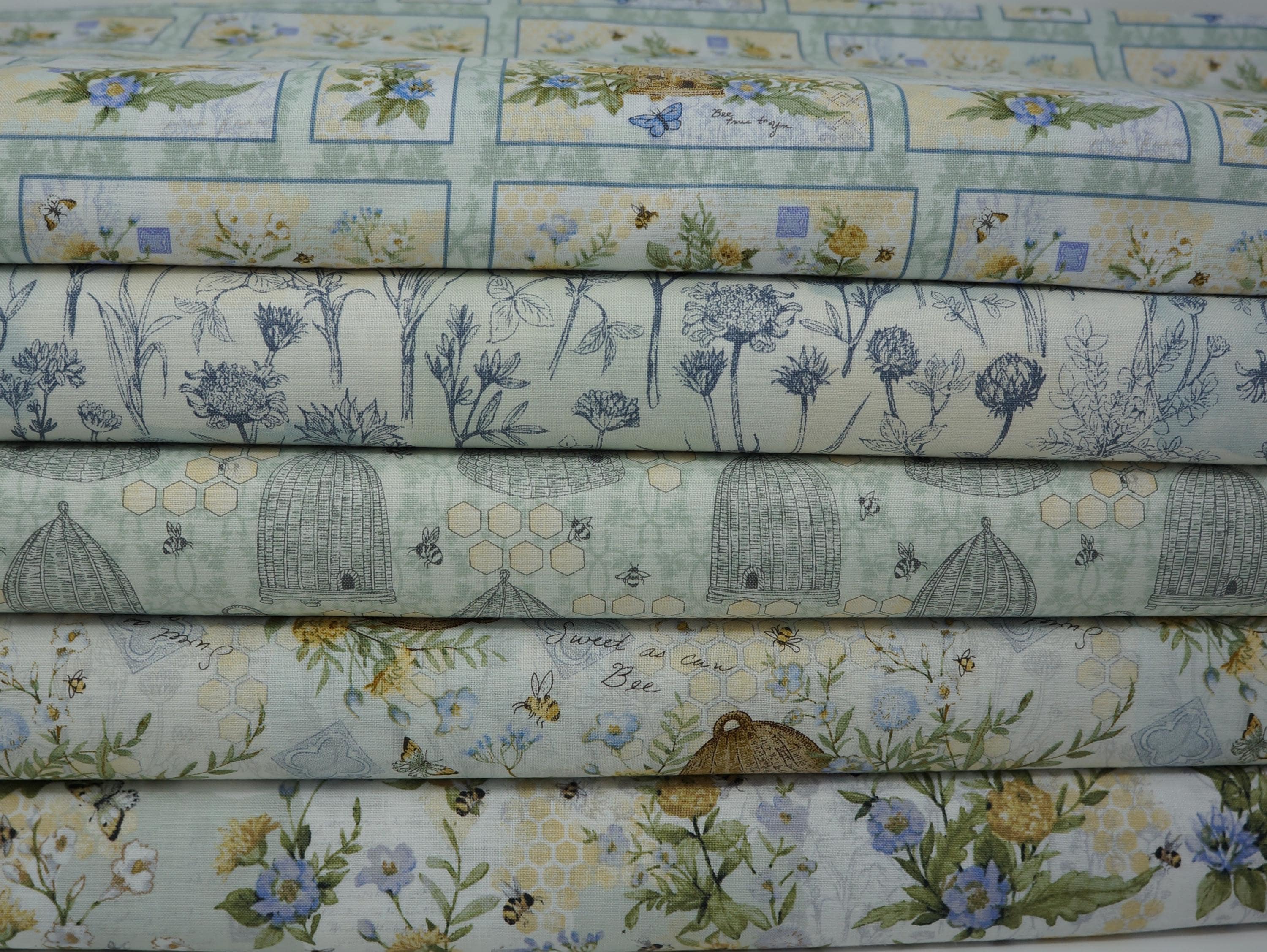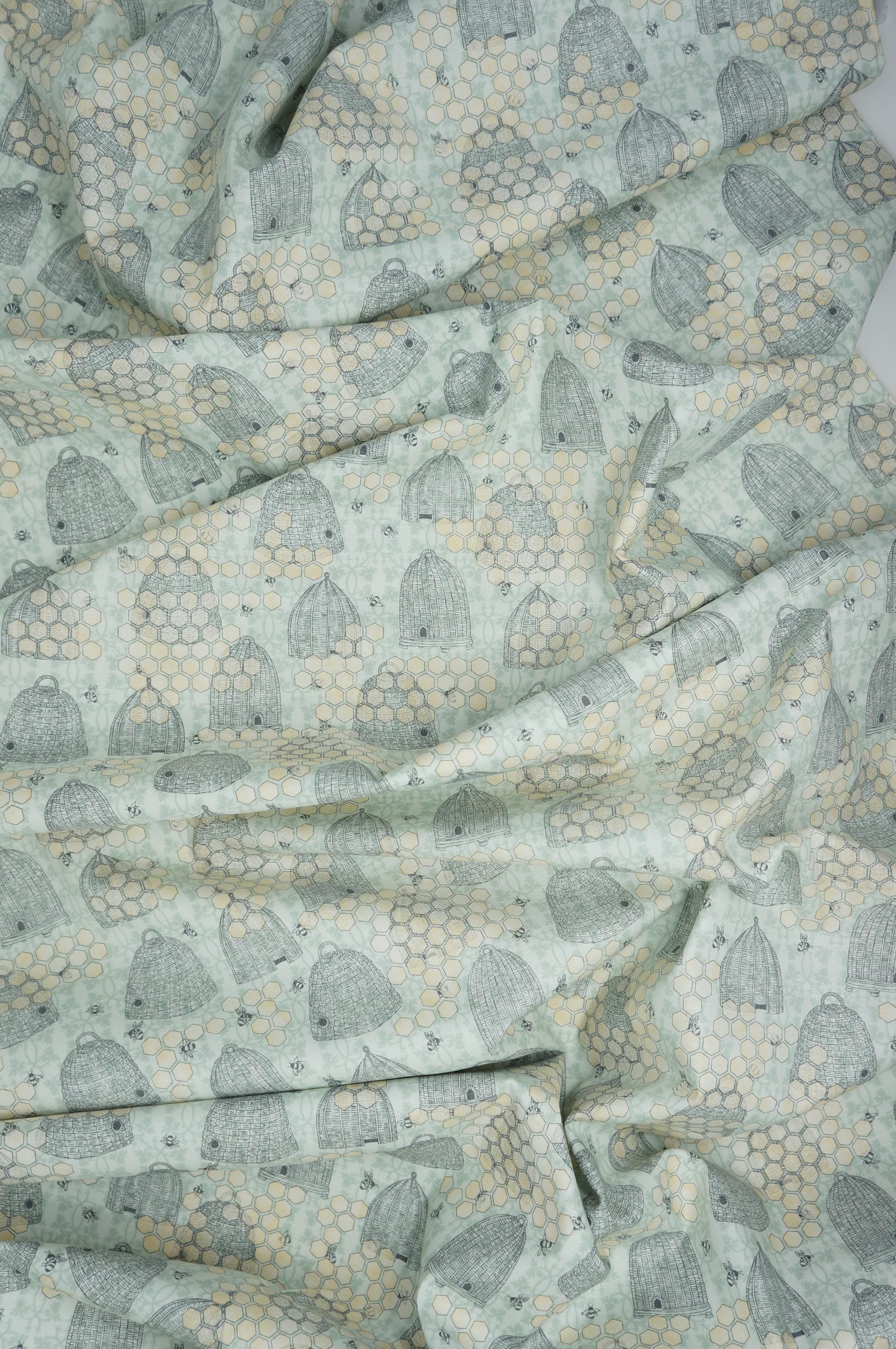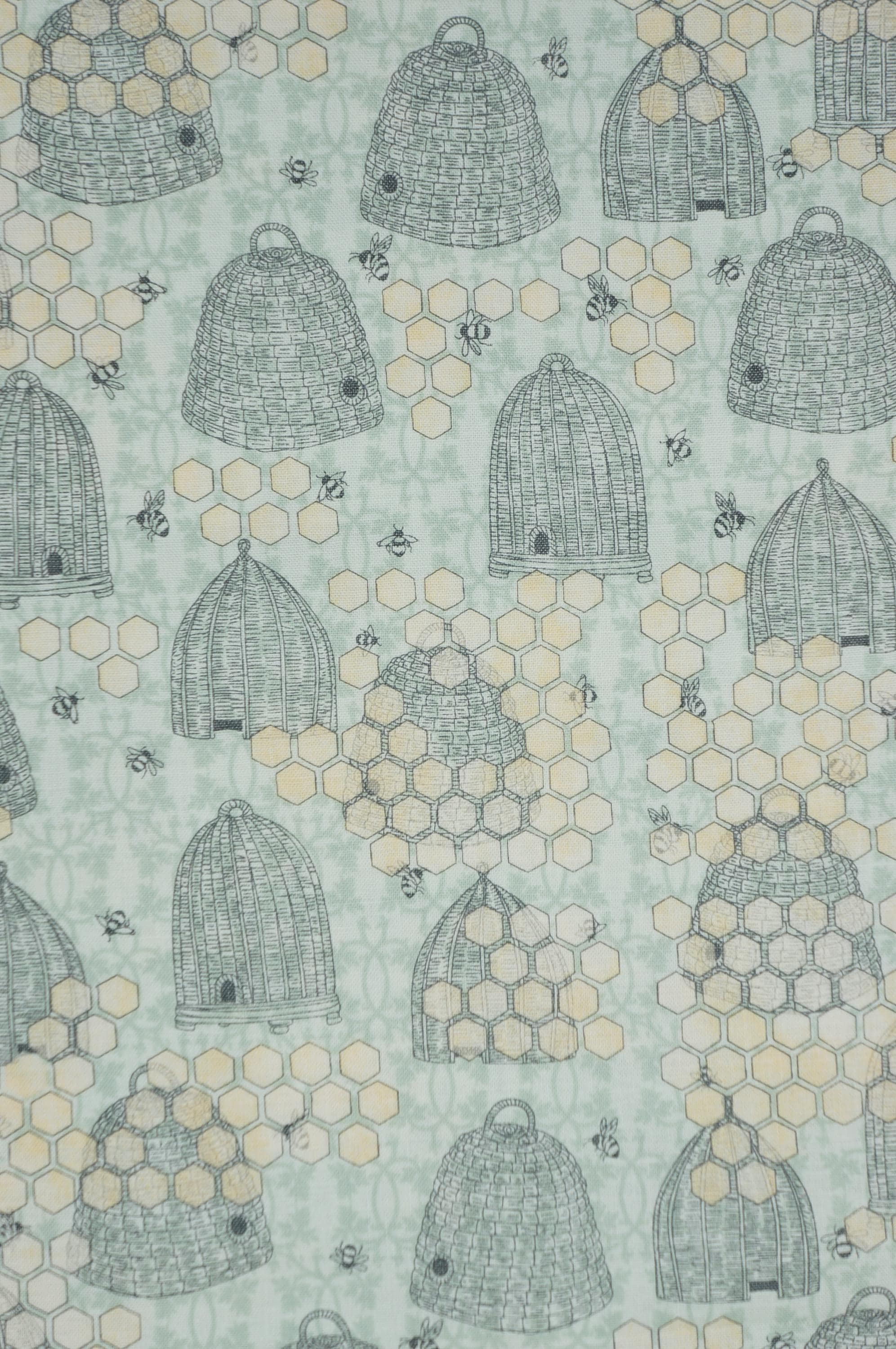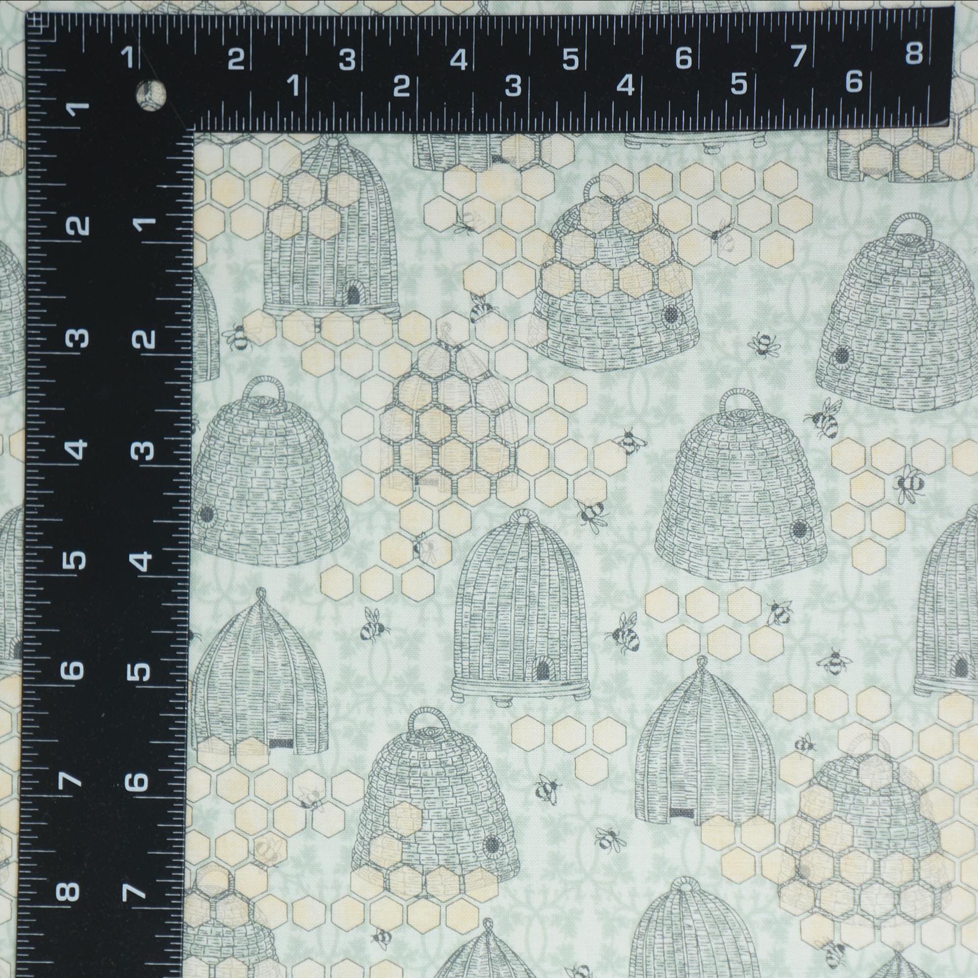 If you love bees and vintage style, you'll adore this fabric from the Sweet As Can Bee Collection by Susan Winget for Springs Creative. This novelty cotton fabric features a delightful beehive pattern scattered across a soft pastel blue-green background. Sketch-like beehives in subtle gray tones mimic traditional skep designs, interspersed with golden honeycomb hexagons and tiny buzzing bees, creating a charming, nature-inspired motif that's perfect for adding a touch of rustic elegance to your projects. The fabric is soft and durable, perfect for quilting, home decor, apparel and more. You'll be buzzing with excitement when you see how this fabric adds a touch of sweetness to your projects.