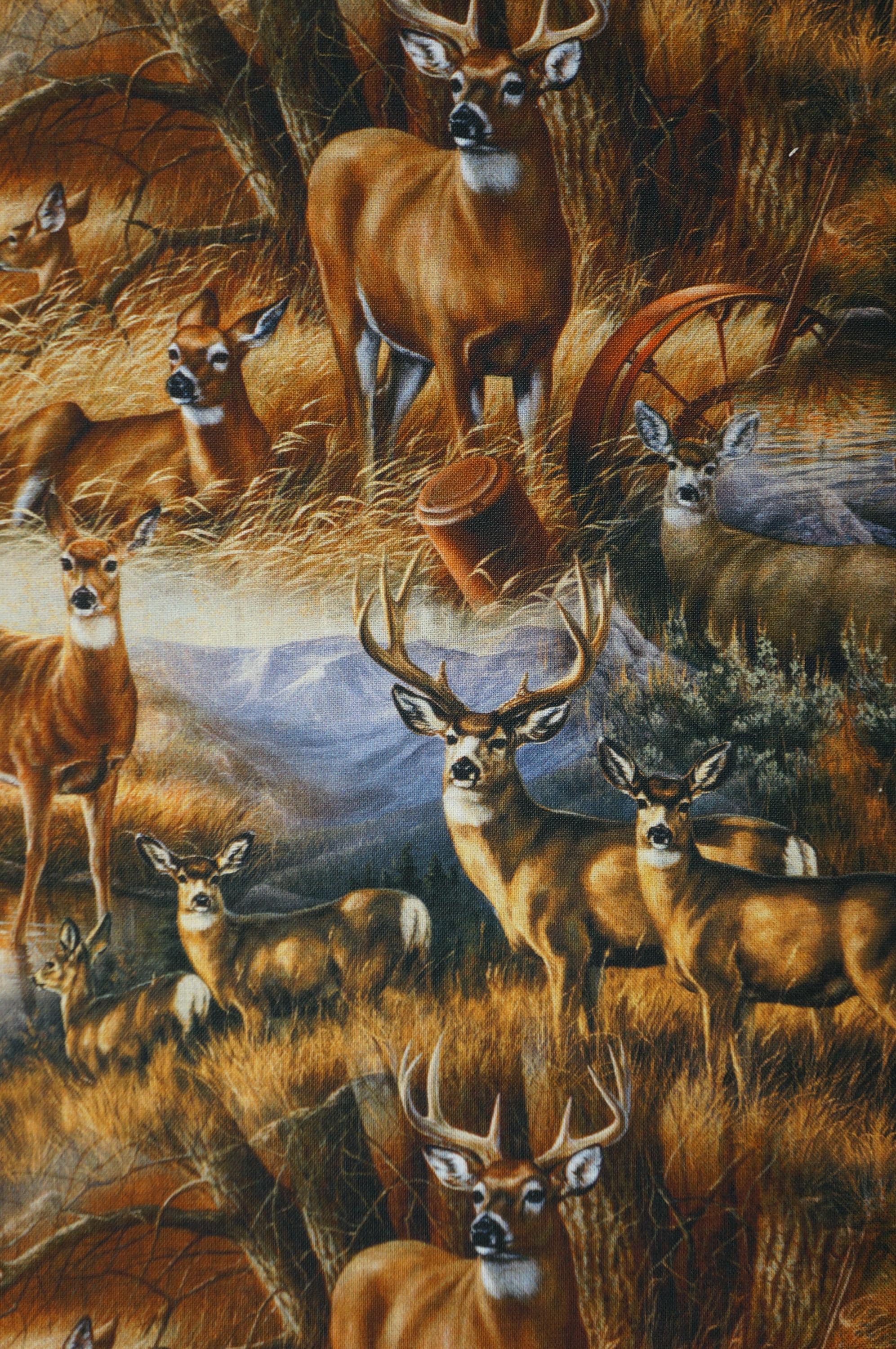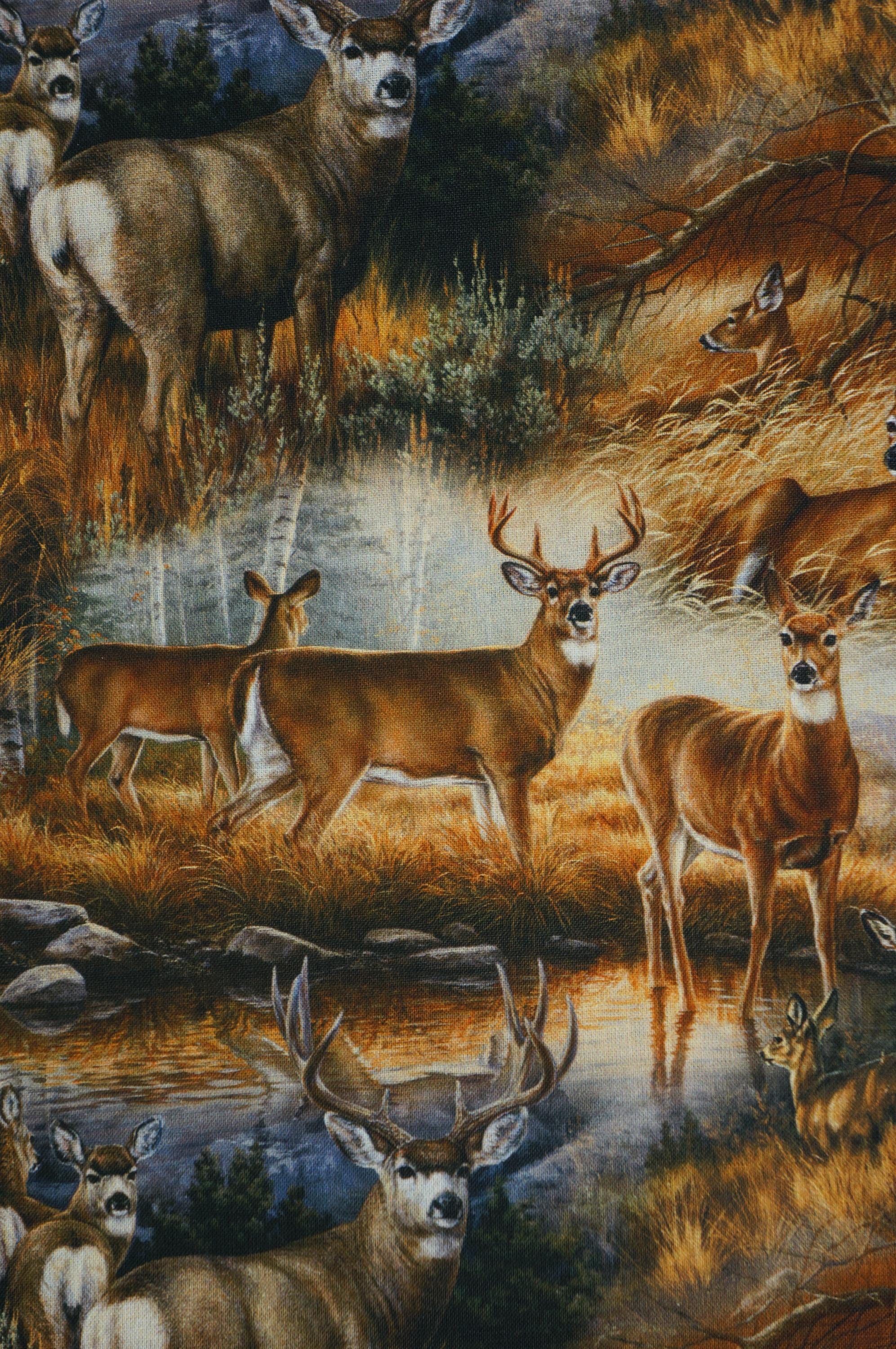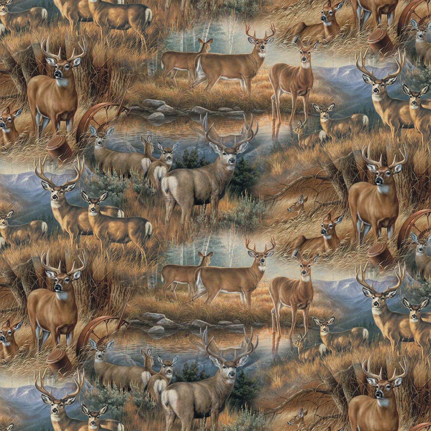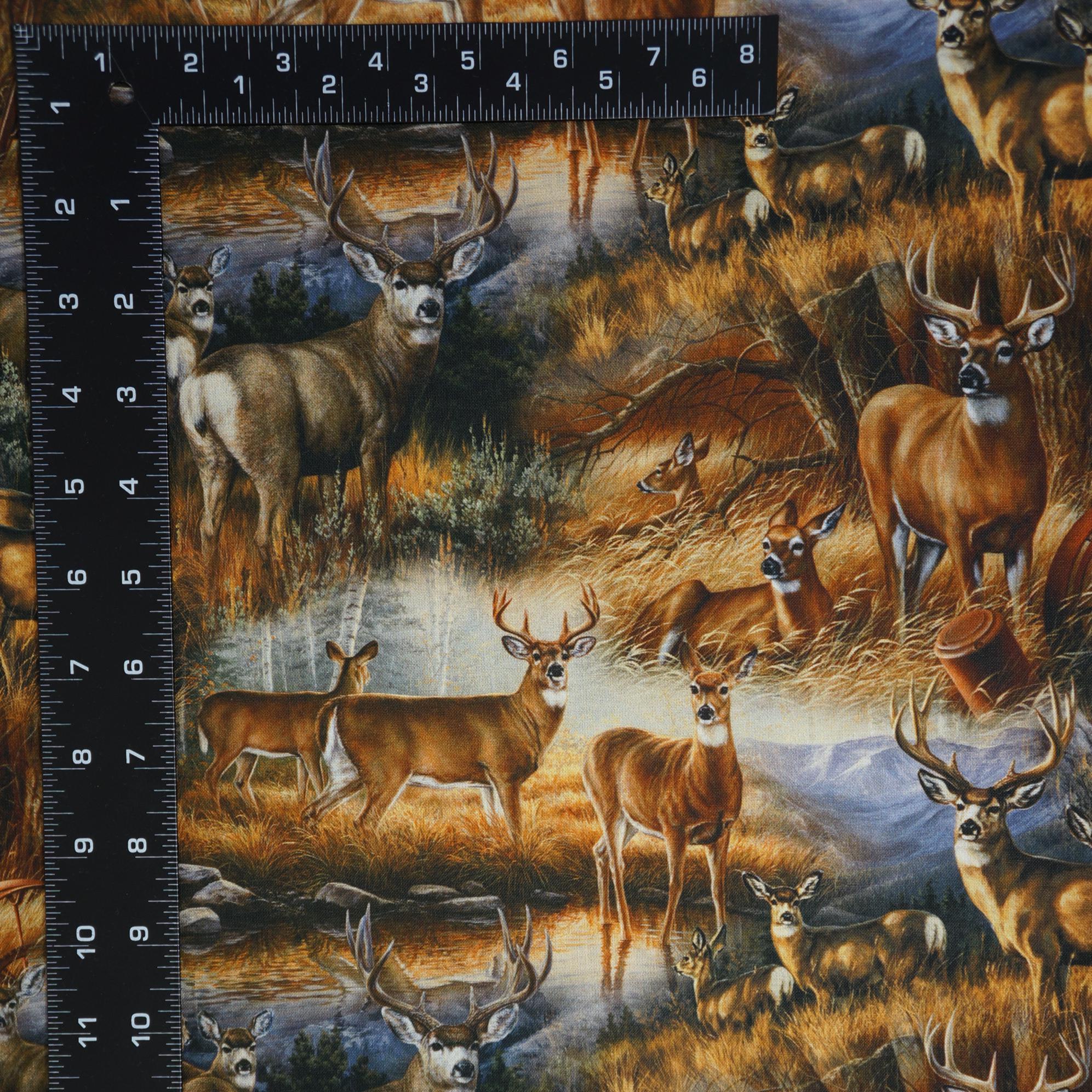 This novelty cotton fabric by David Textiles features a captivating design of deer in their natural habitat, with a variety of poses and settings that bring the wilderness to life. The intricate detailing of the deer, from their majestic antlers to their graceful stances, is set against a backdrop of tall grasses and distant mountains, creating a vivid and dynamic scene perfect for nature enthusiasts and those looking to add a touch of the outdoors to their projects.
