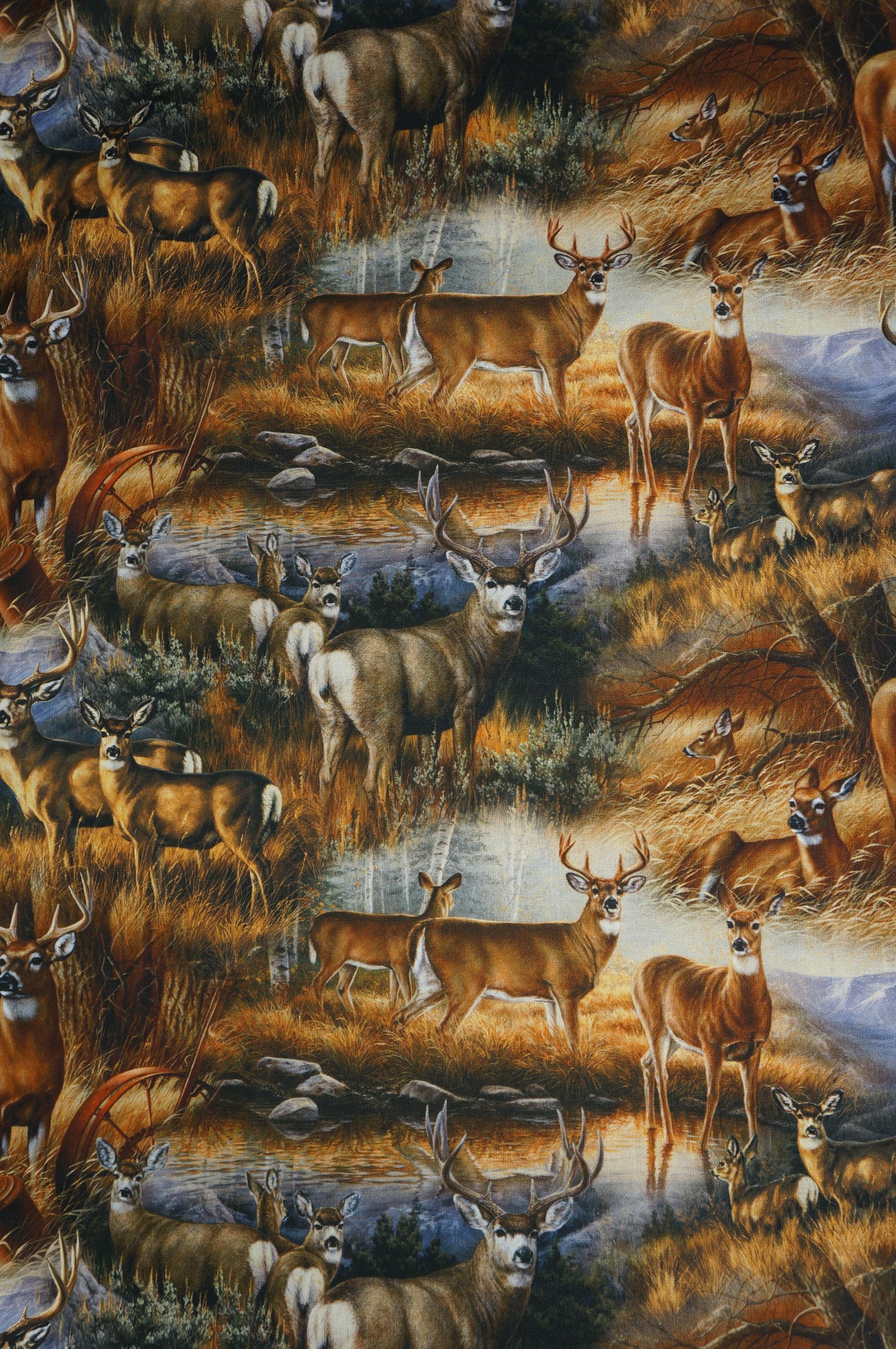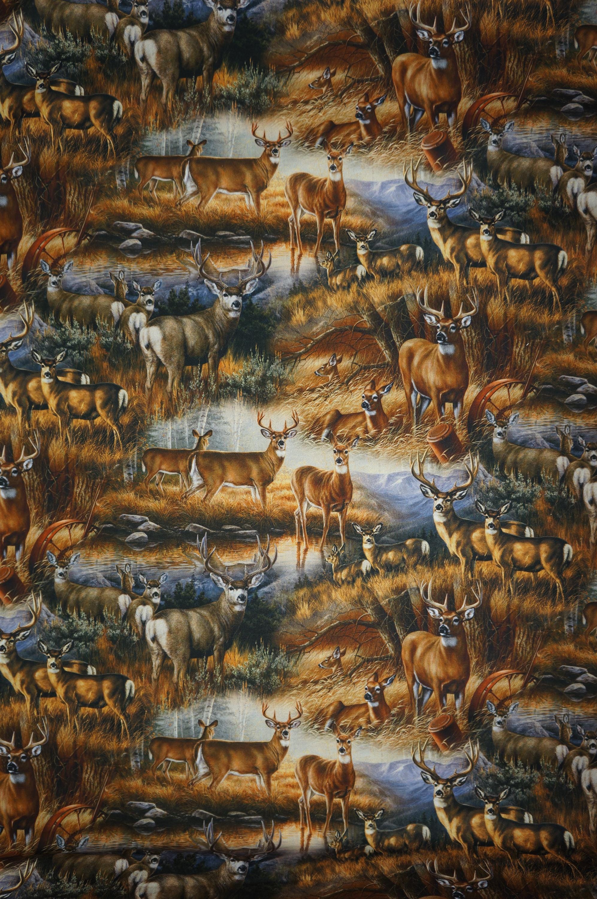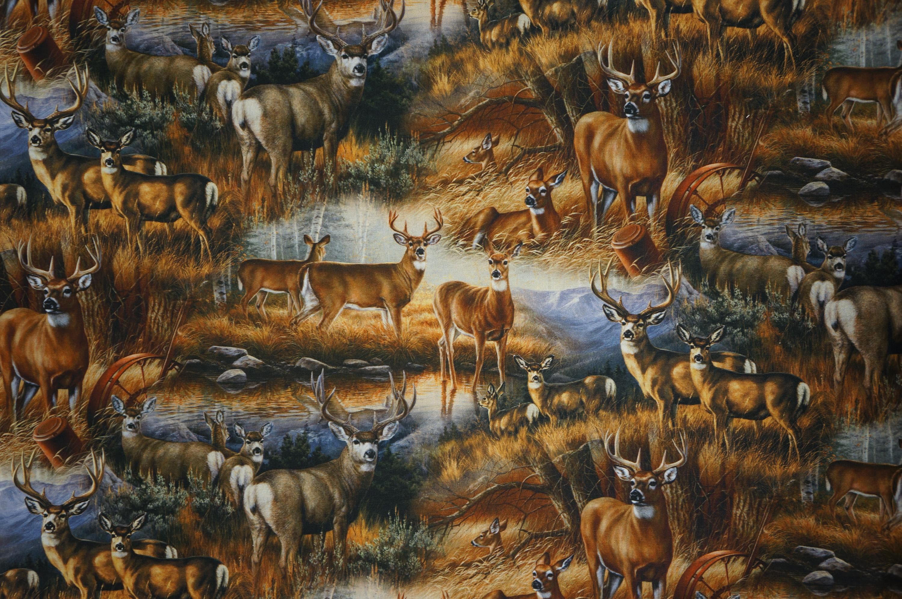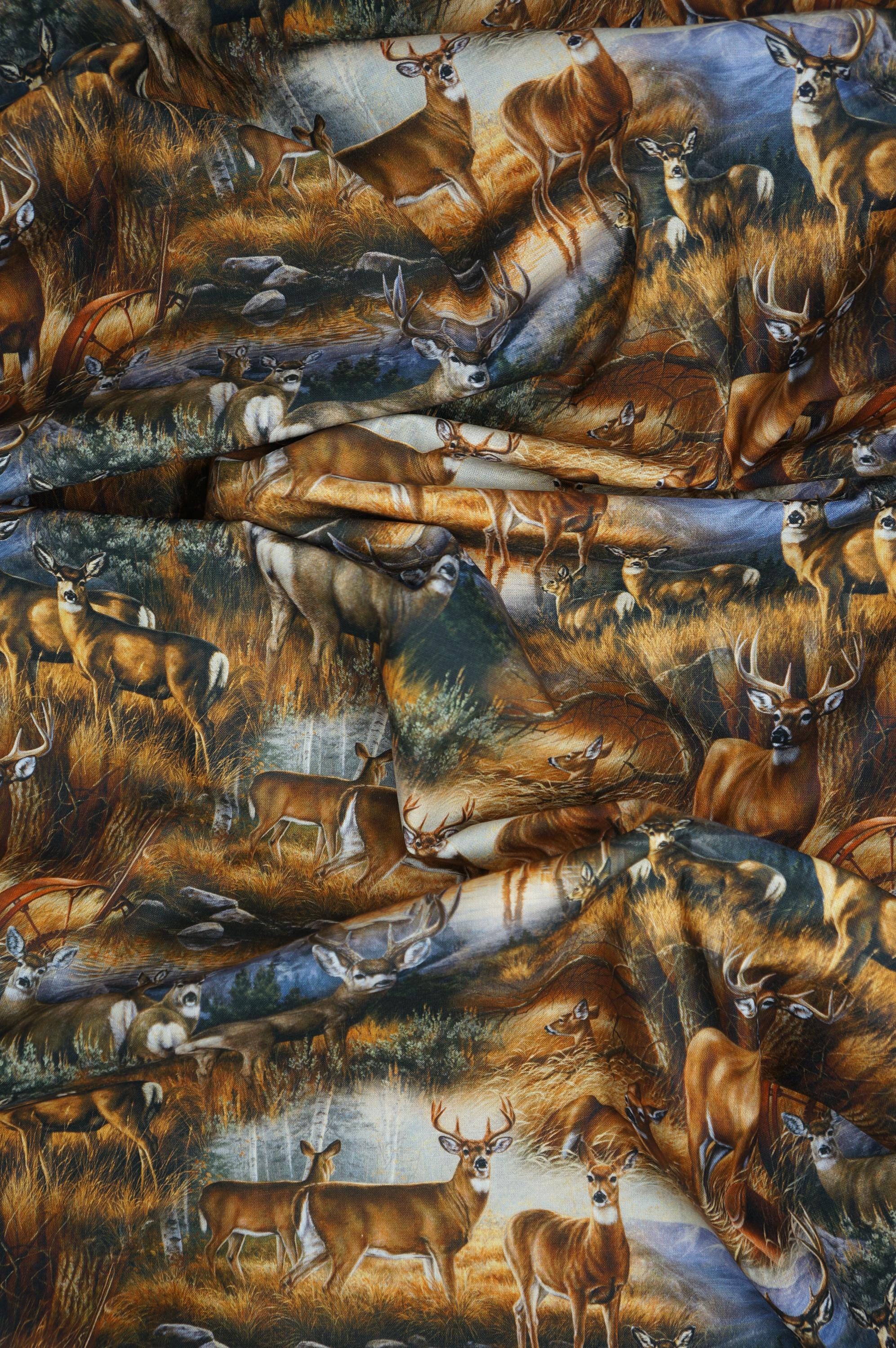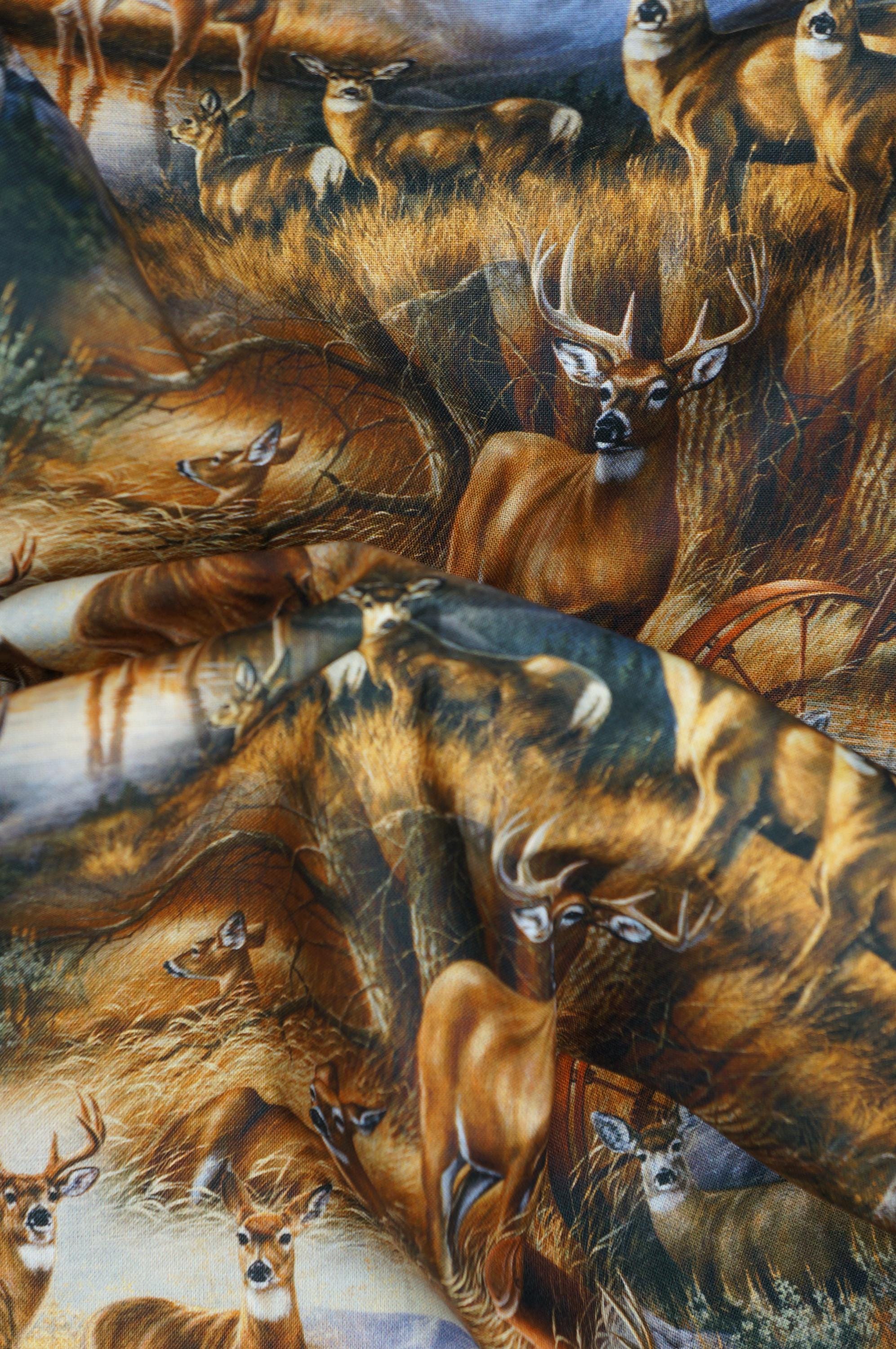 This novelty cotton fabric by David Textiles features a captivating design of deer in their natural habitat, with a variety of poses and settings that bring the wilderness to life. The intricate detailing of the deer, from their majestic antlers to their graceful stances, is set against a backdrop of tall grasses and distant mountains, creating a vivid and dynamic scene perfect for nature enthusiasts and those looking to add a touch of the outdoors to their projects.