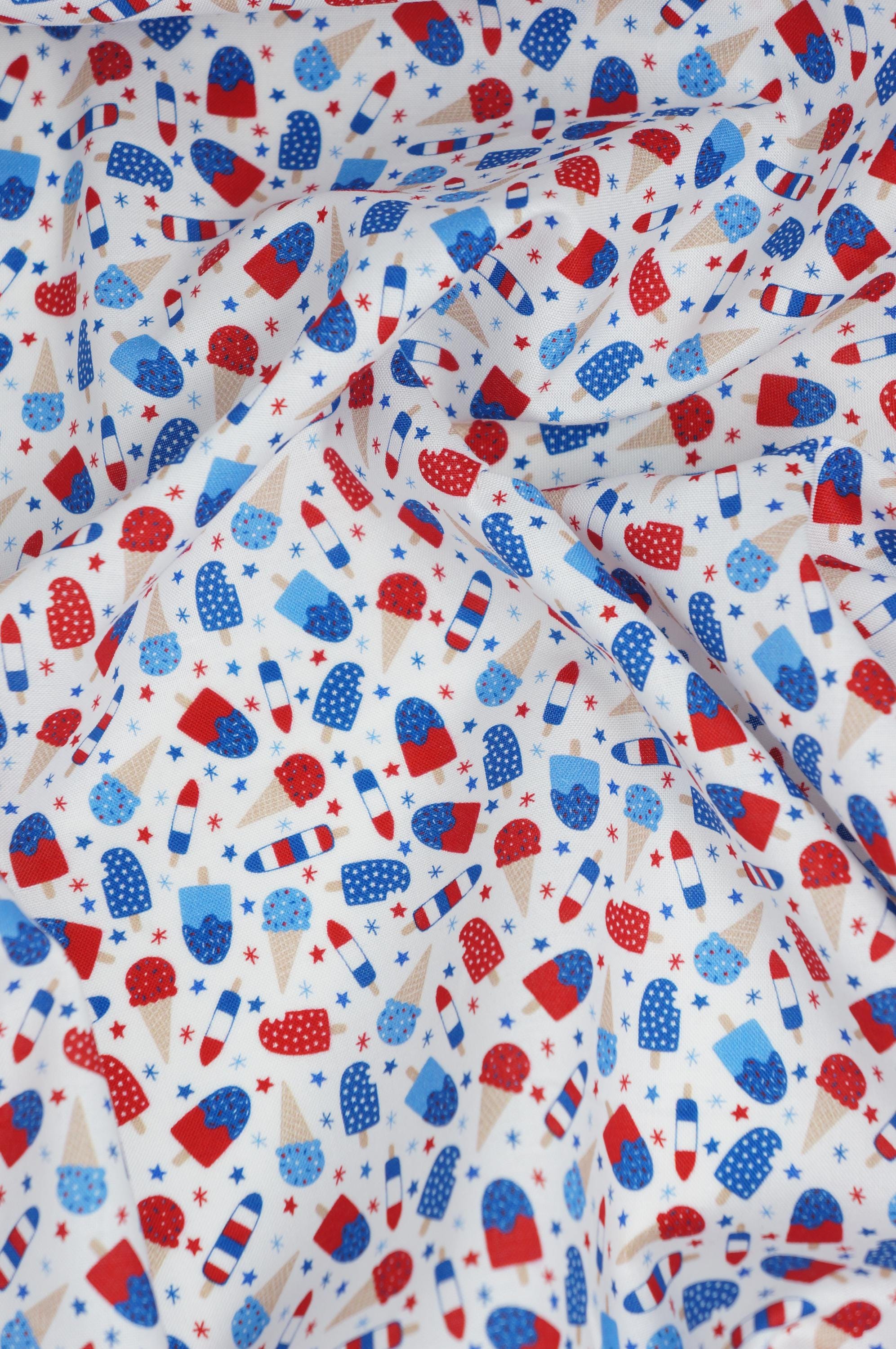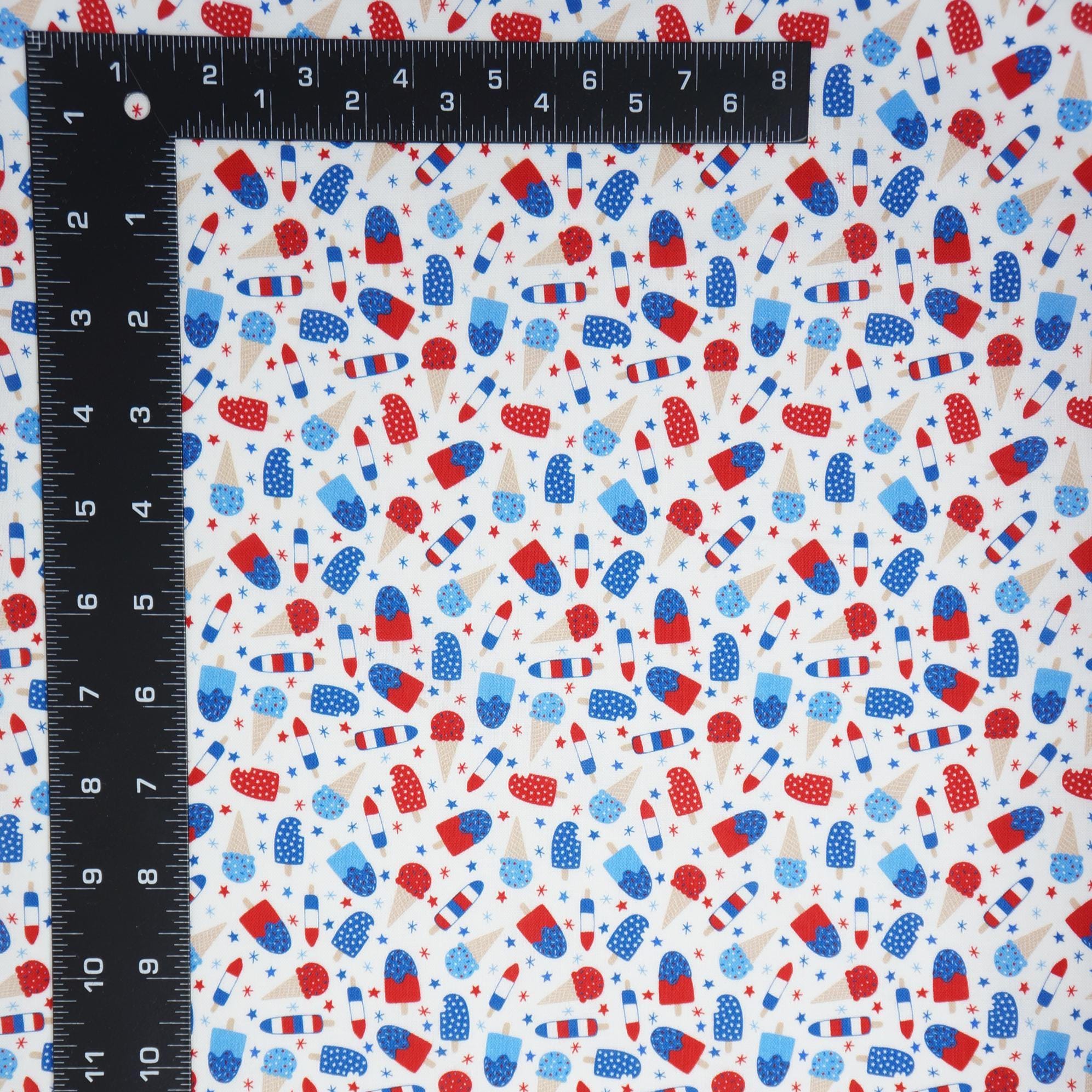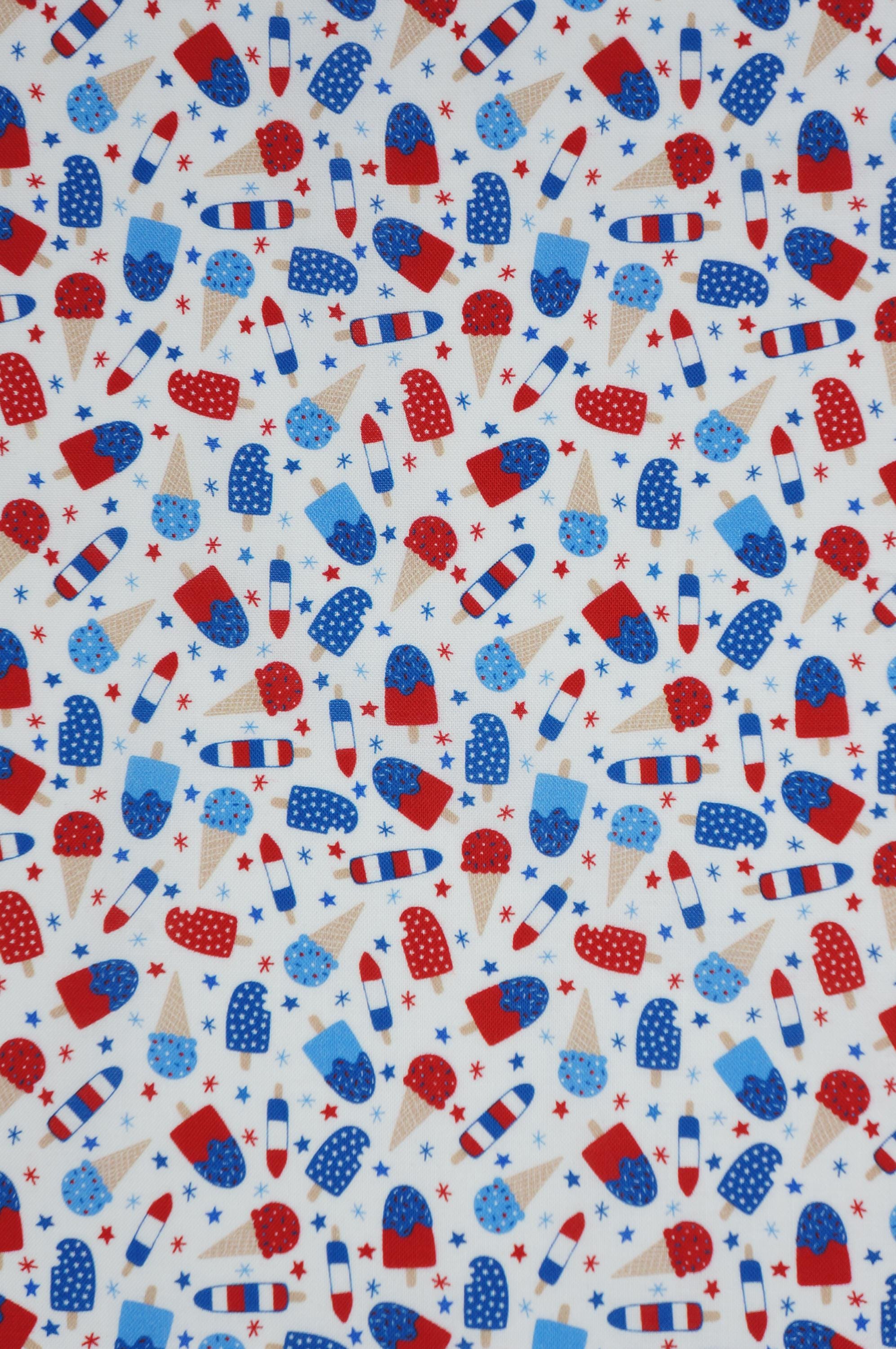 Celebrate Independence Day with this adorable patriotic popsicle quilting cotton fabric from P & B Textiles! From the Patriotic Minis Collection this vibrant fabric features a delightful array of patriotic-themed ice cream treats, including cones, popsicles, and rockets, all adorned with stars. The design is set against a crisp white background, making the red, white, and blue elements pop, creating a festive and fun Americana vibe perfect for summer projects or celebrations.