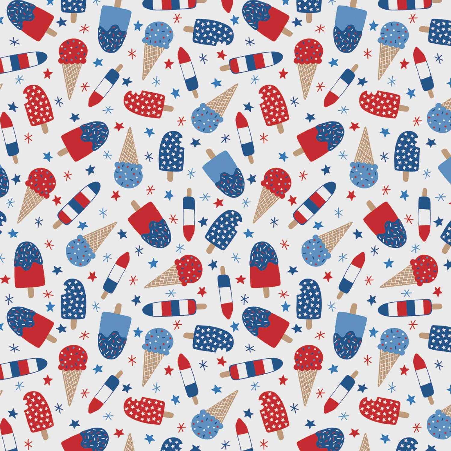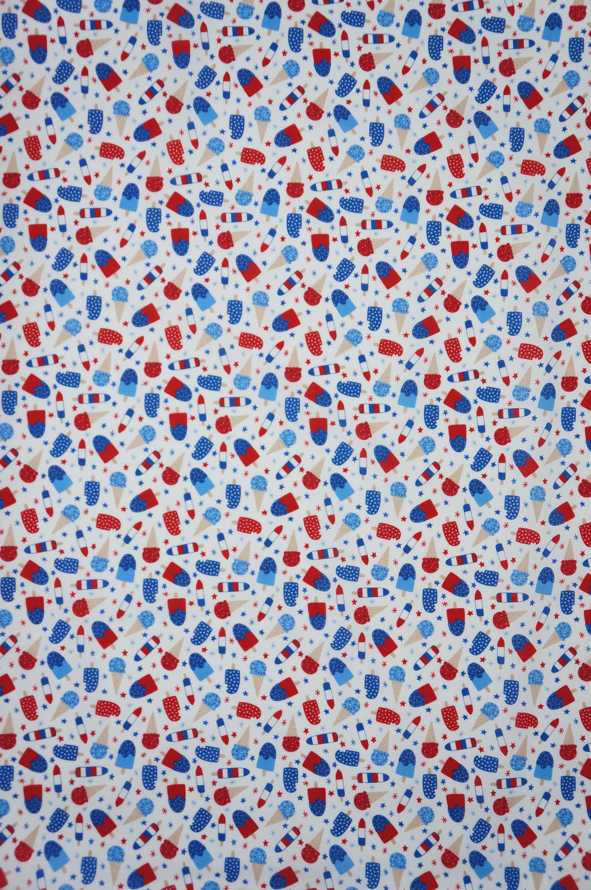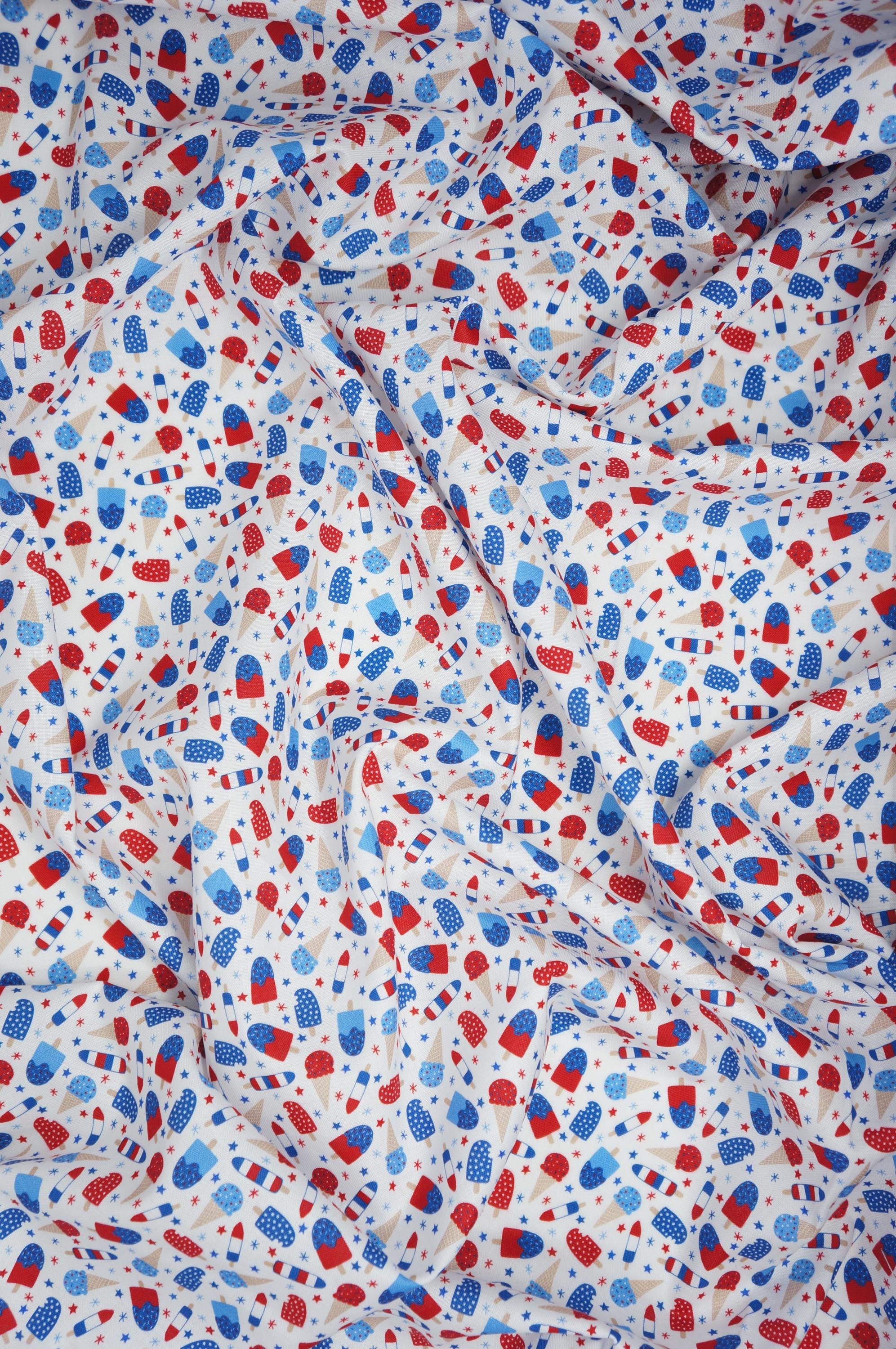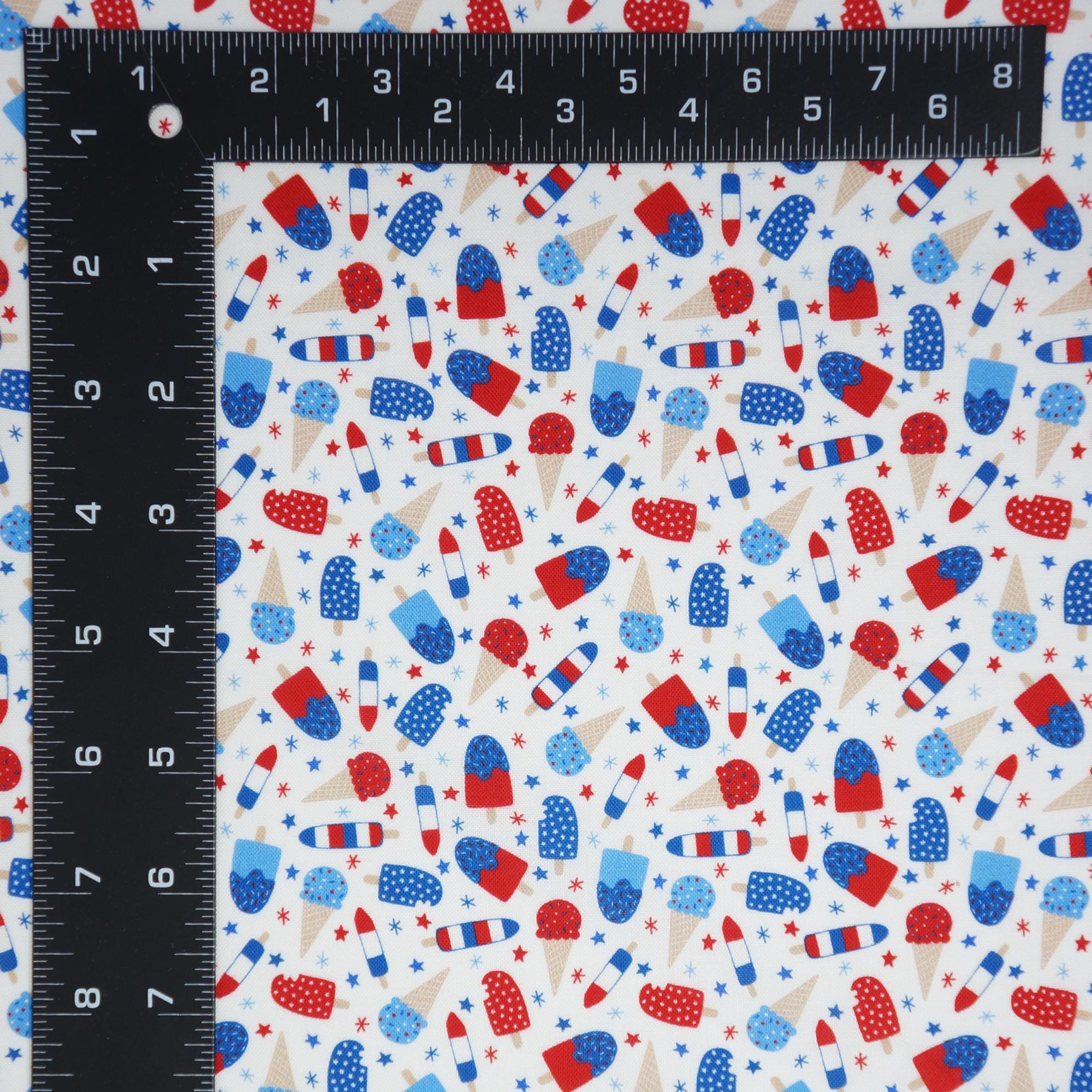 Celebrate Independence Day with this adorable patriotic popsicle quilting cotton fabric from P & B Textiles! From the Patriotic Minis Collection this vibrant fabric features a delightful array of patriotic-themed ice cream treats, including cones, popsicles, and rockets, all adorned with stars. The design is set against a crisp white background, making the red, white, and blue elements pop, creating a festive and fun Americana vibe perfect for summer projects or celebrations.