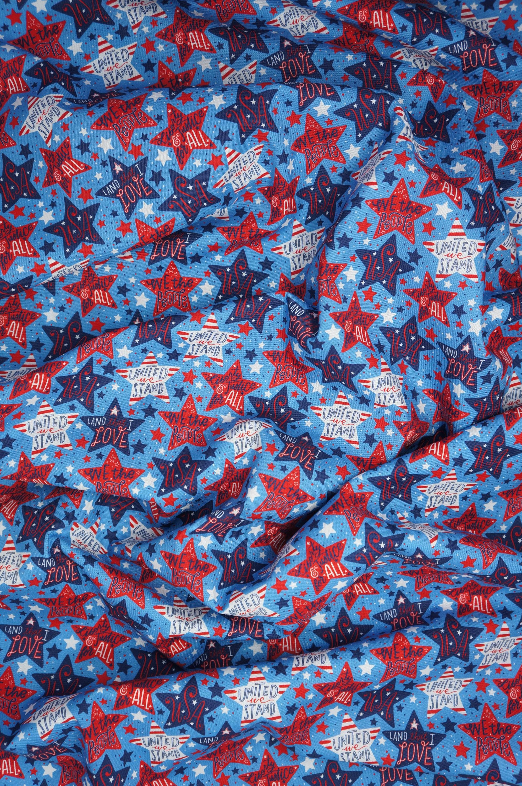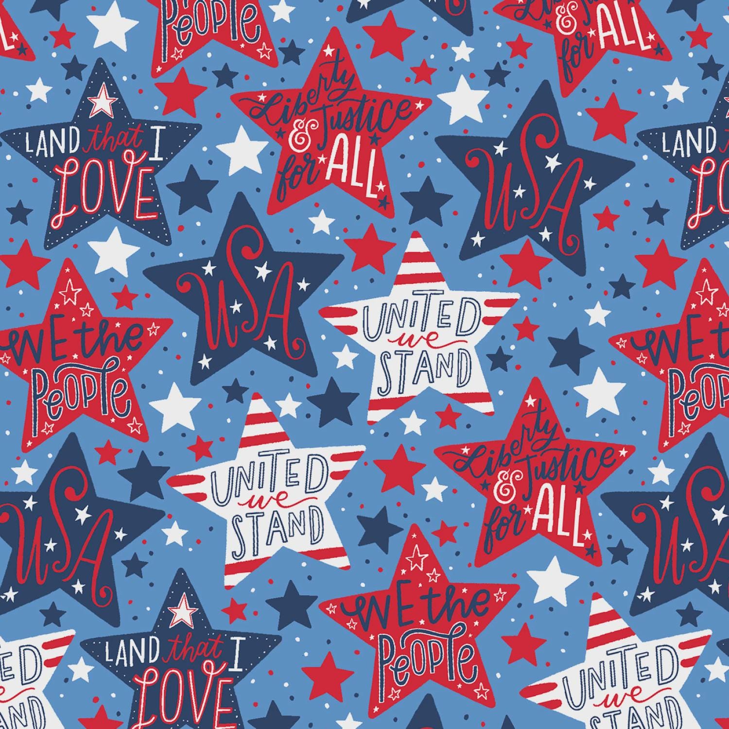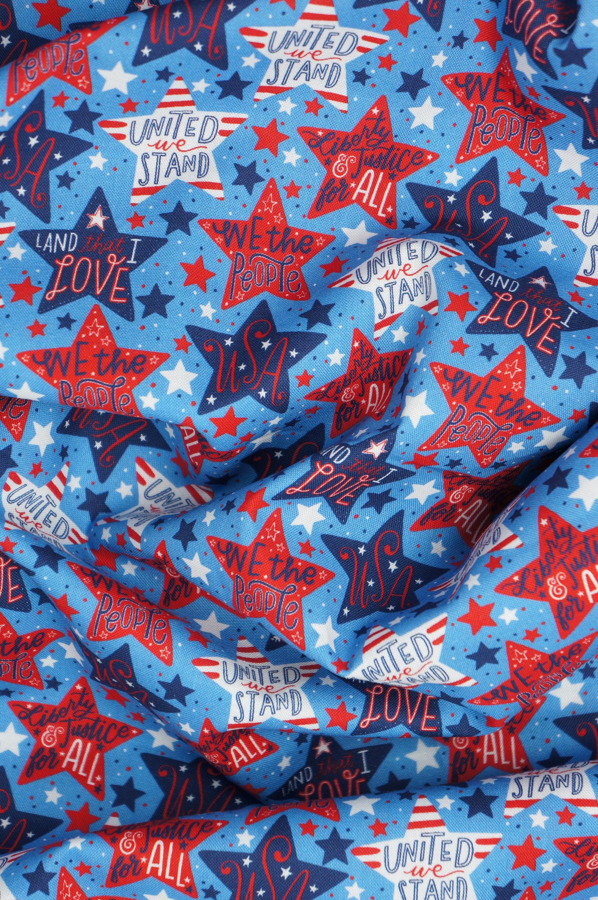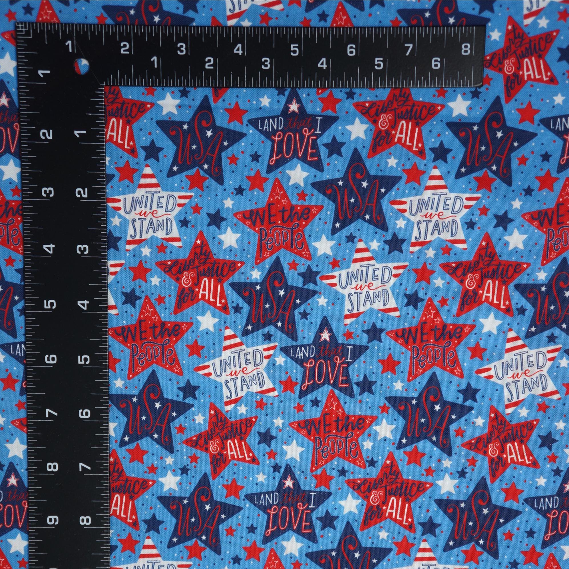 Celebrate Independence Day with this adorable patriotic stars quilting cotton fabric from P & B Textiles! From the Patriotic Minis Collection this vibrant fabric features a delightful array of patriotic-themed stars with various patriotic phrases such as "United We Stand", "We the People", and "Land that I Love". The design is set against a light blue background, making the red, white, and blue stars pop, creating a festive and fun Americana vibe perfect for summer projects or celebrations.