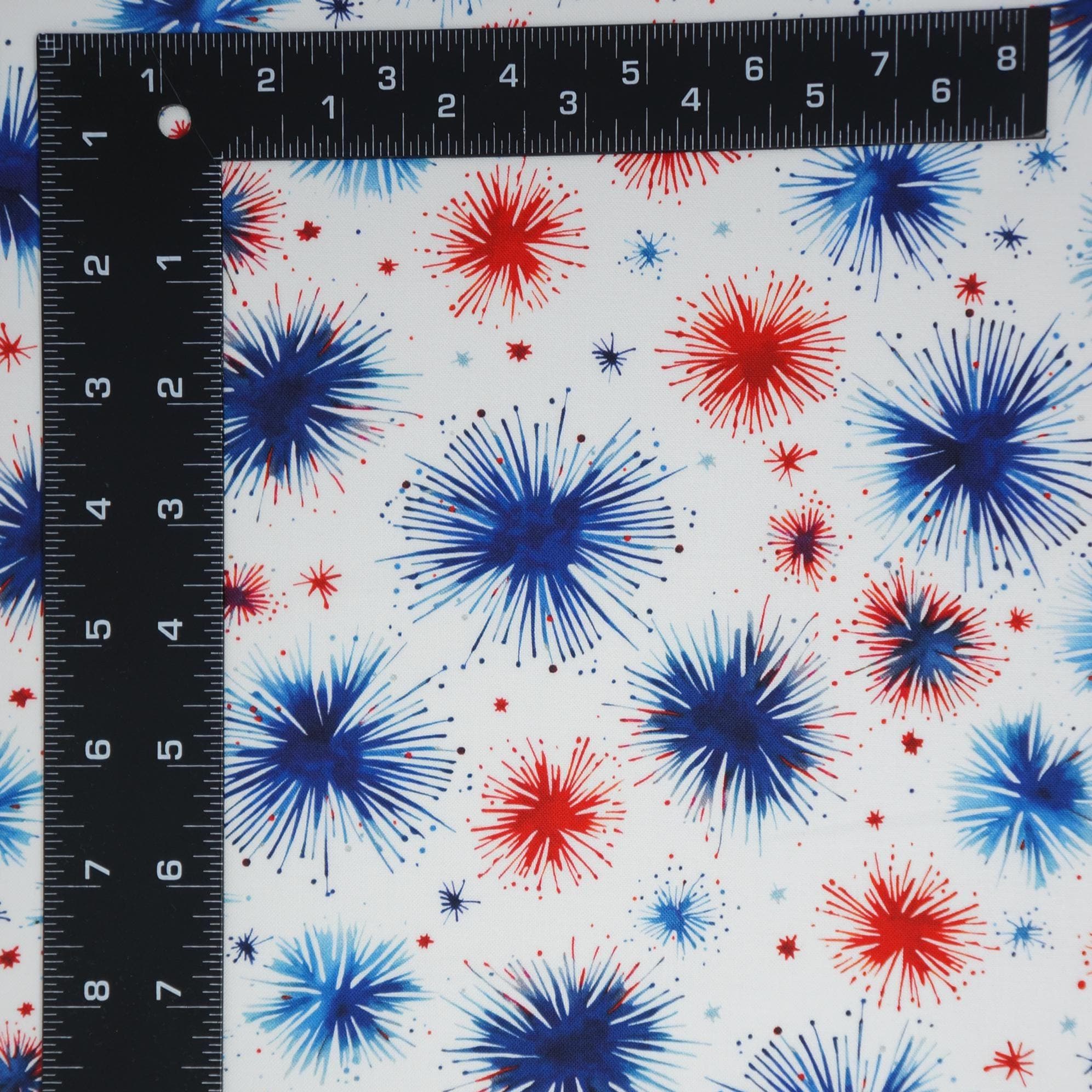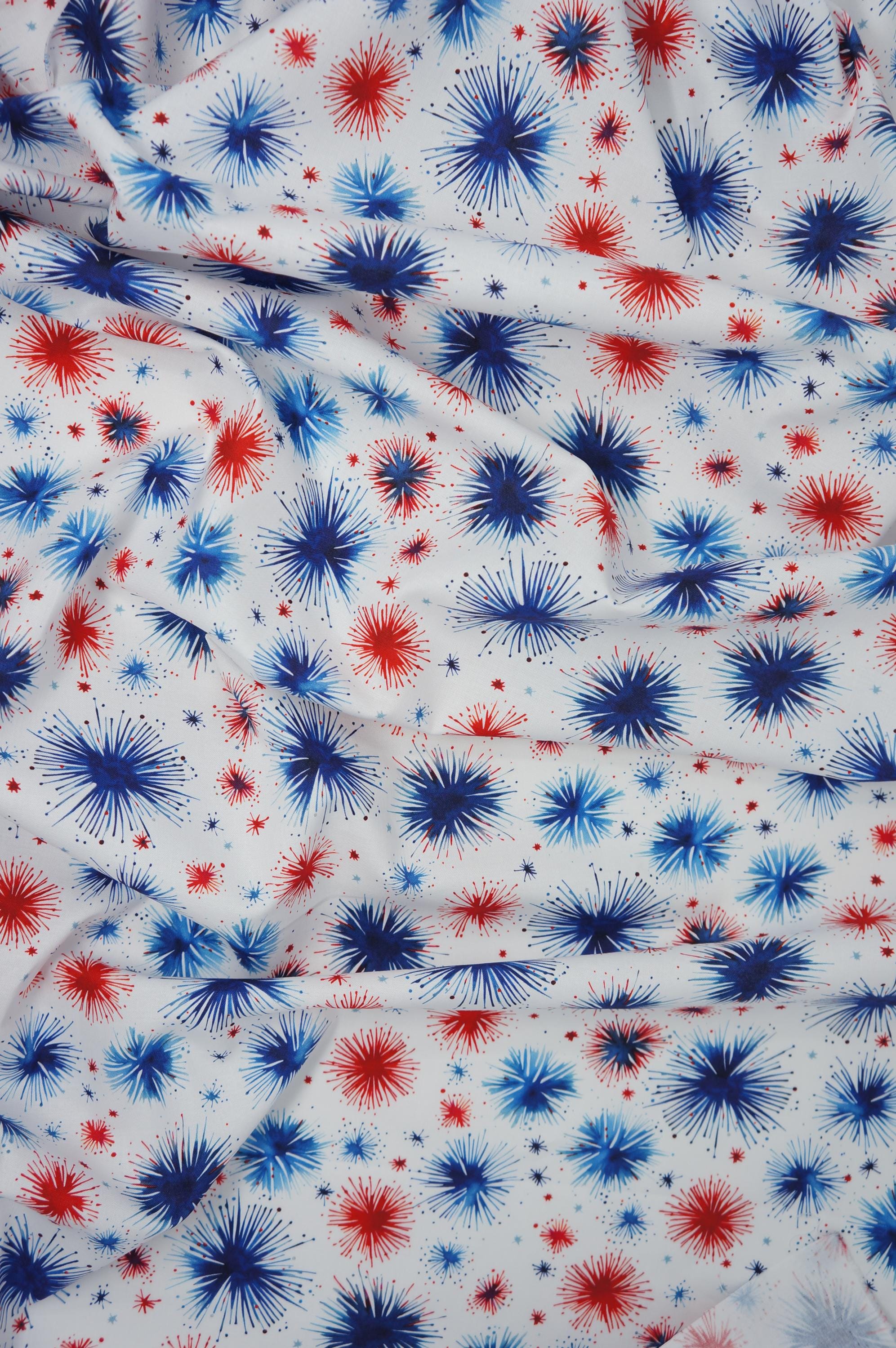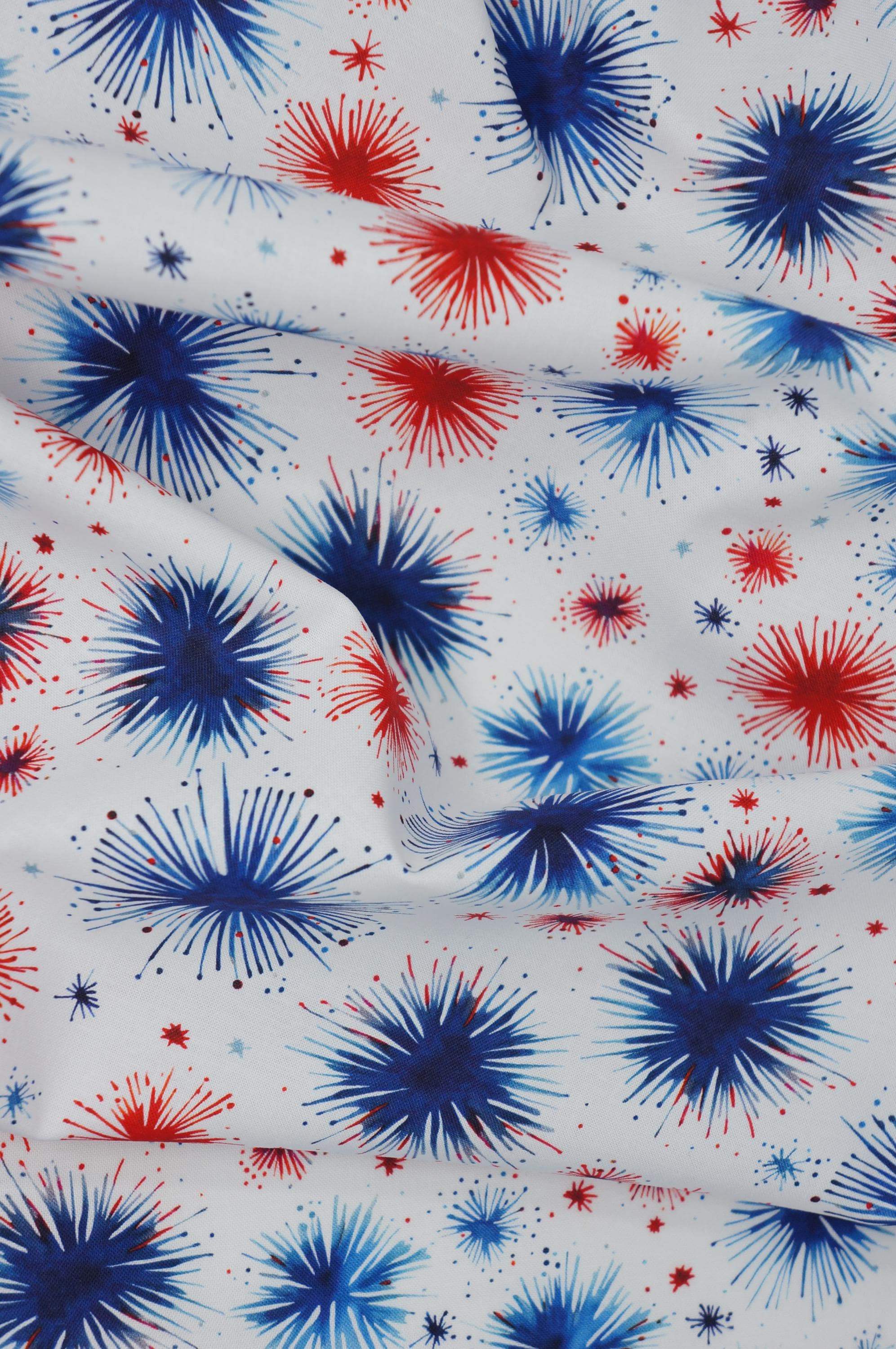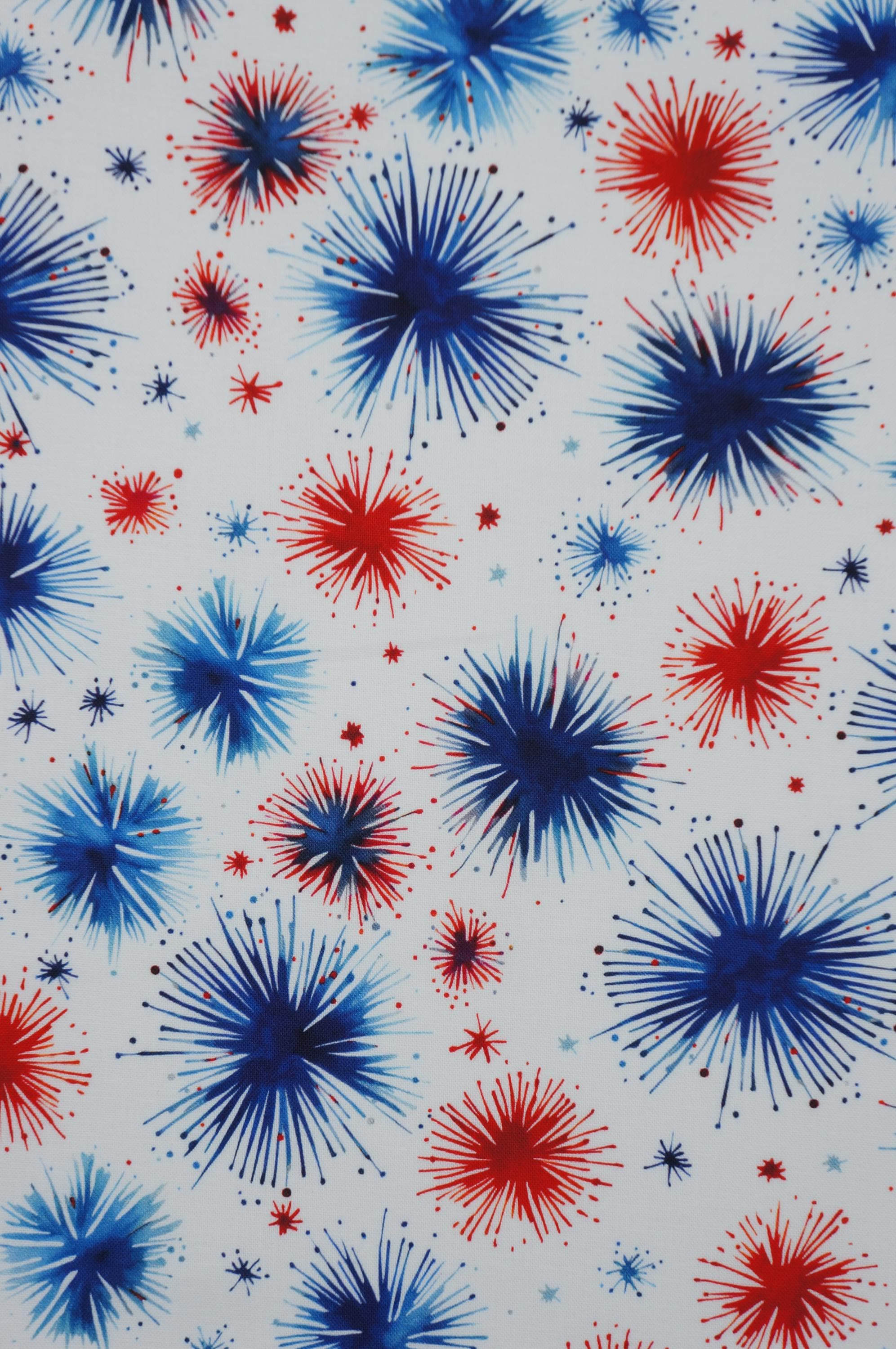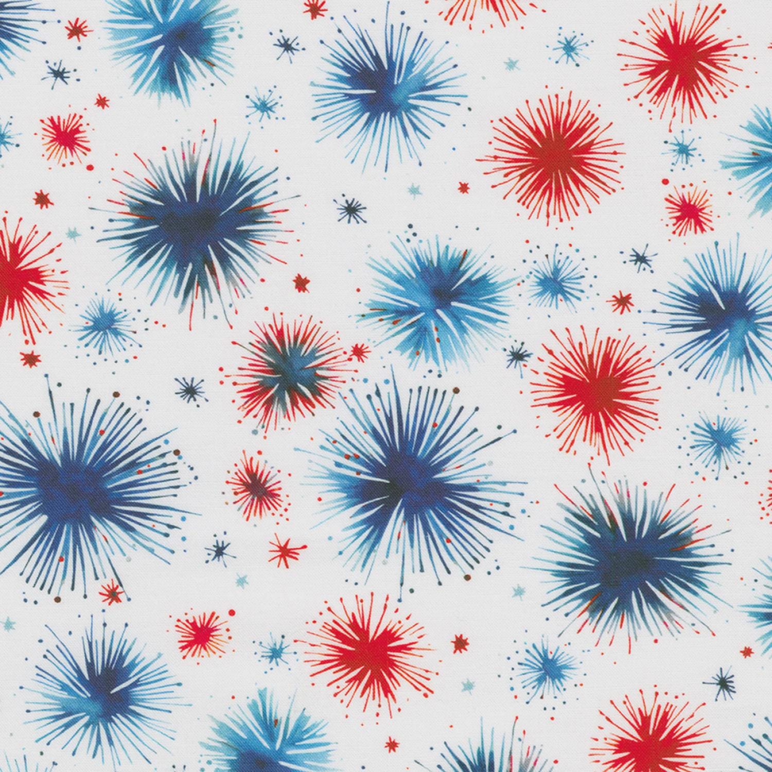 Celebrate your creativity with this bright and festive patriotic quilting cotton by RK Studios for Robert Kaufman! Set on a crisp white background, this lively design features bursts of red and blue fireworks scattered like stars across the sky, giving it a fresh, cheerful, and modern Americana feel. The playful mix of bold and delicate starbursts adds movement and excitement, making it perfect for eye-catching quilts, summer table décor, picnic accessories, and fun holiday apparel. Crafted from premium quilting cotton, it’s soft, durable, and easy to sew—ideal for projects you’ll love bringing out year after year. If you’re looking to add a clean, classic, and celebratory touch to your creations, this fabric is ready to make your projects sparkle! Please note that this fabric is digitally printed and not a batik.