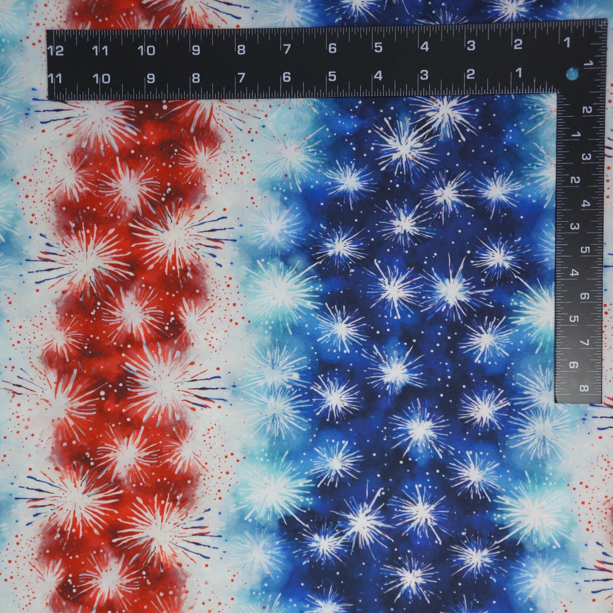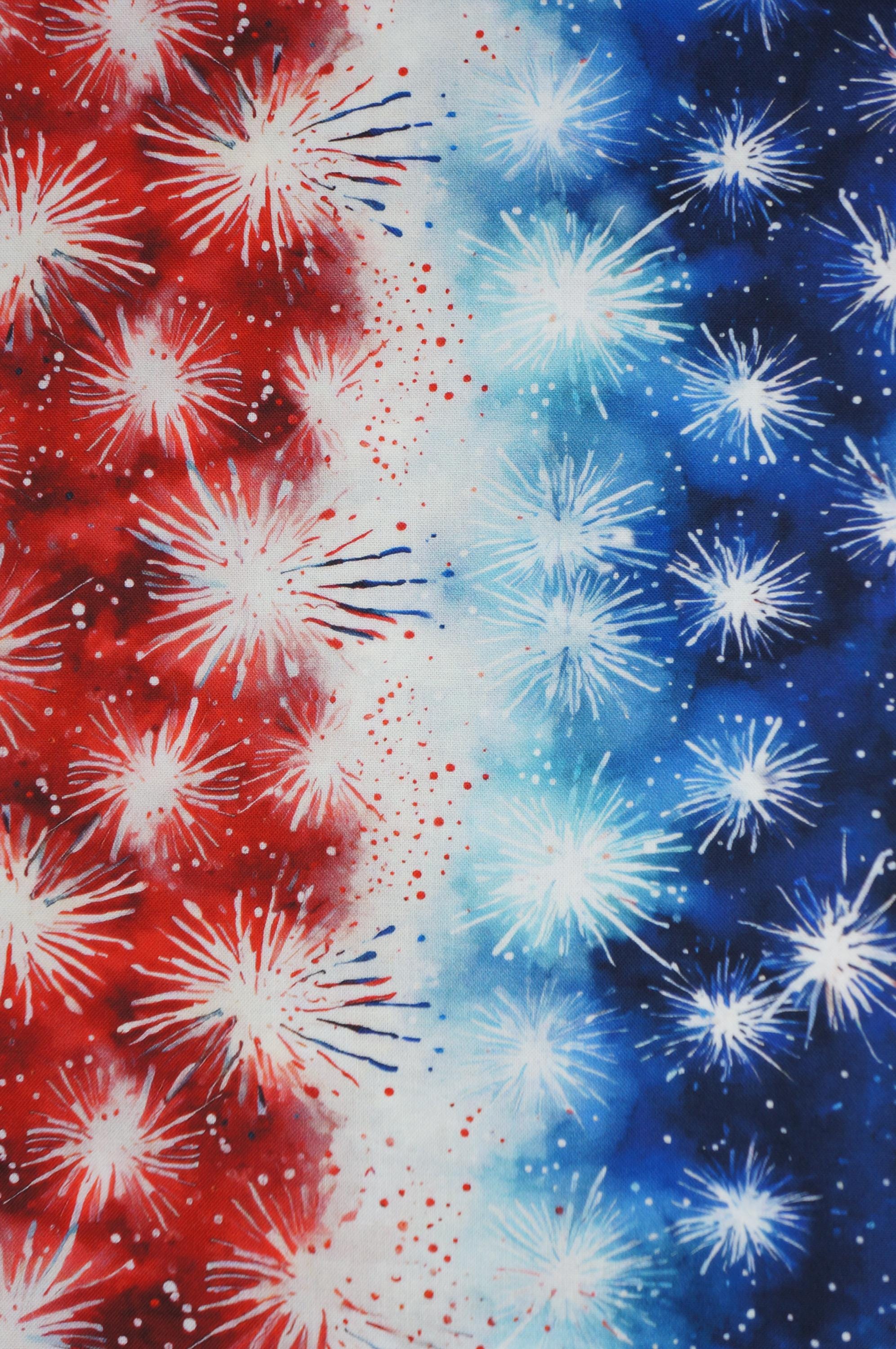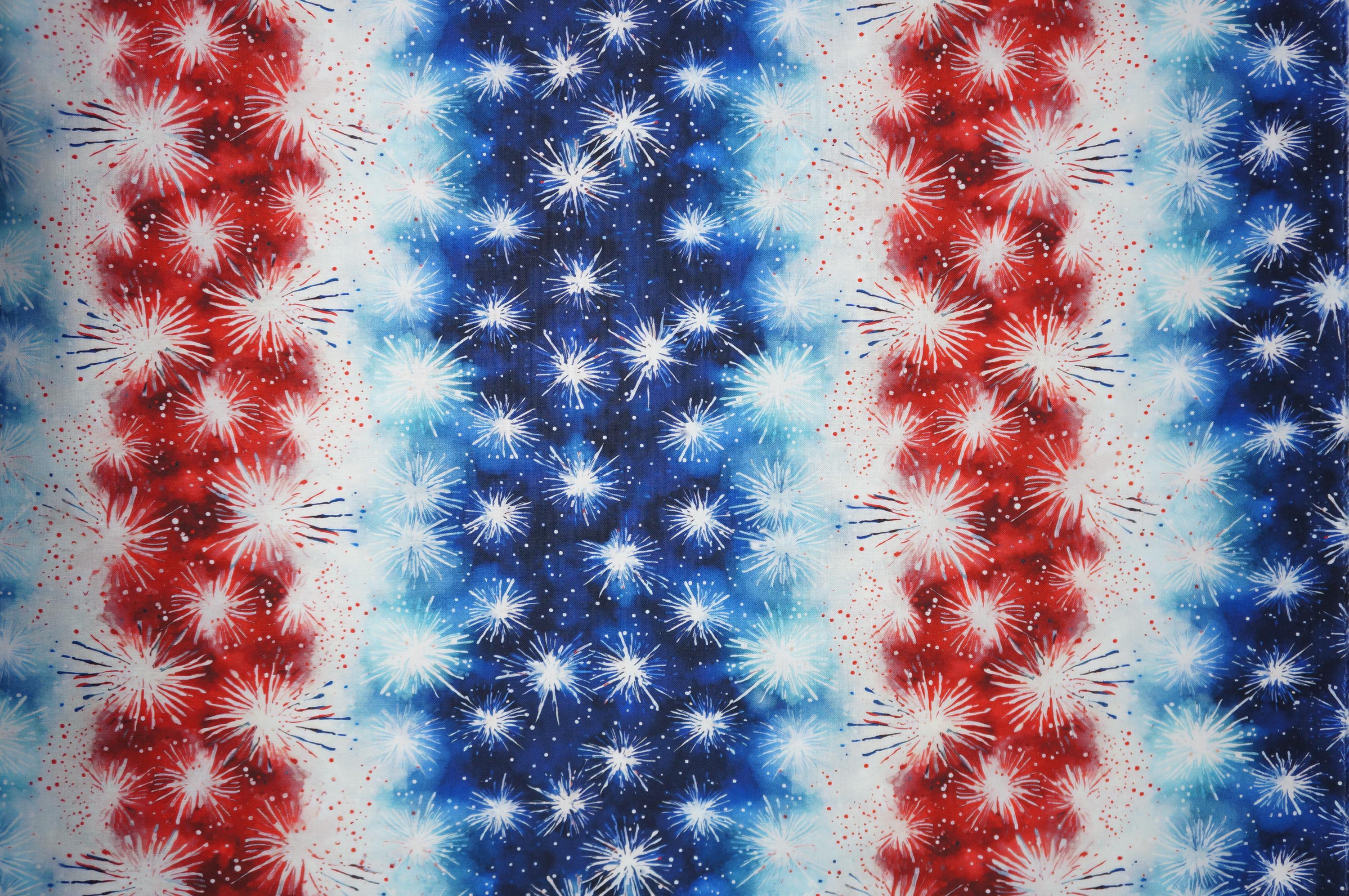 Celebrate in star-spangled style with this dazzling patriotic quilting cotton by RK Studios for Robert Kaufman! Featuring vibrant stripes of red, white, and blue filled with firework bursts, this design captures the magic of summer nights and festive celebrations. The repeating stripe pattern makes it perfect for creating eye-catching quilts, table runners, borders, and coordinated projects with a bold Americana flair. Crafted from premium quilting cotton, it’s soft, durable, and easy to sew—ideal for everything from holiday décor to picnic-ready accessories and patriotic apparel. If you’re looking to add a bright, festive sparkle to your creations, this fabric is sure to light up every project! Please note that this fabric is digitally printed and not a batik.